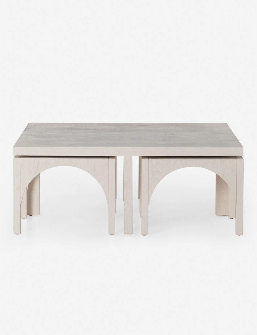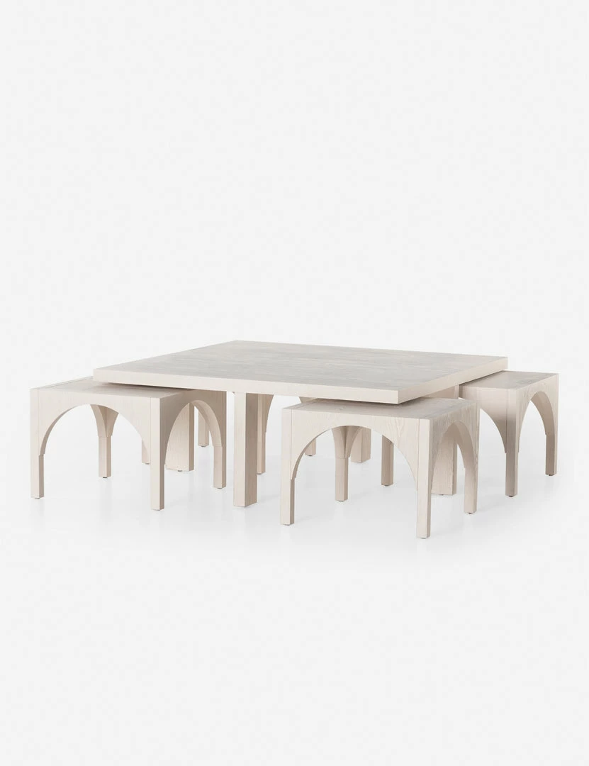 A wholly unique oak coffee table with four separate nesting tables featuring arched legs that lend a clean, sculptural beauty. Its whitewashed oak hue, stunning lines, and clever functionality make this the ideal wood coffee table for an elevated everyday living space.