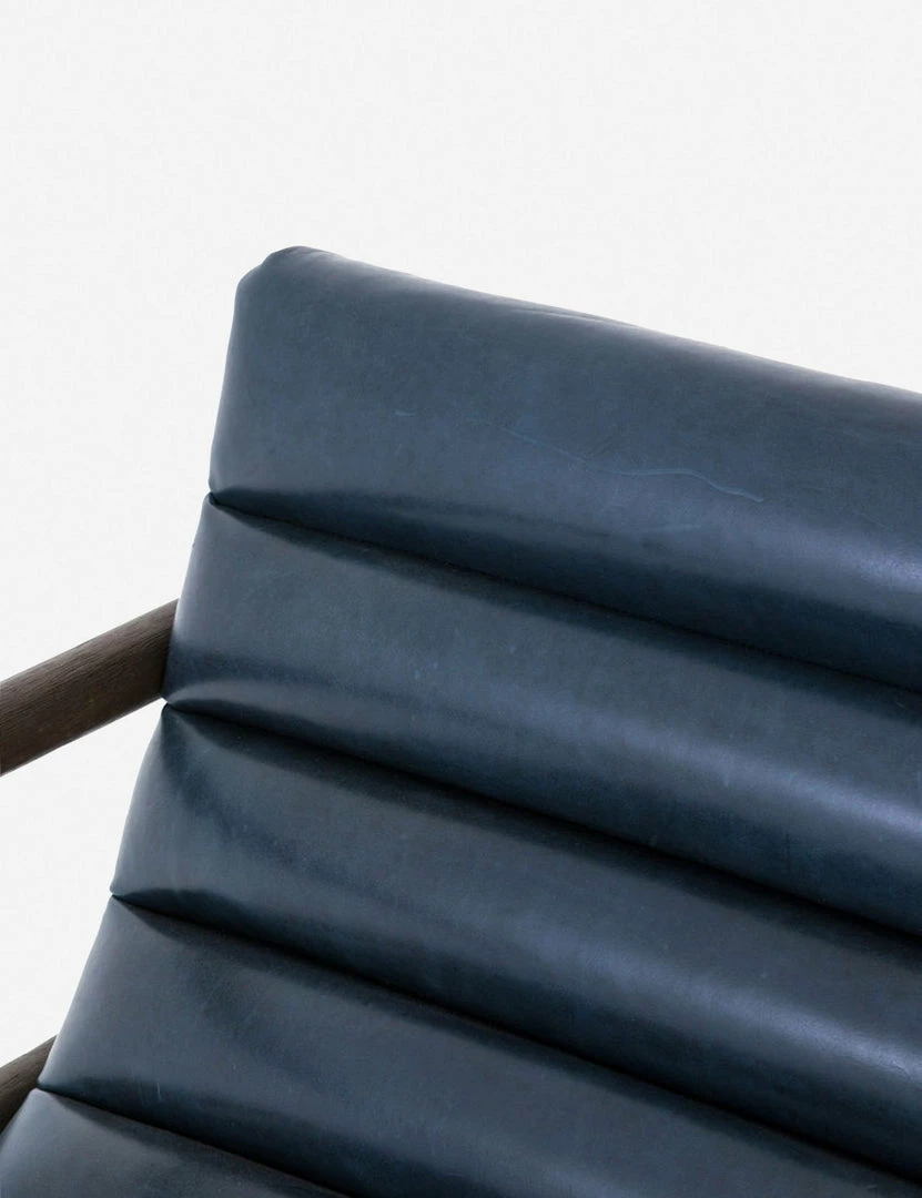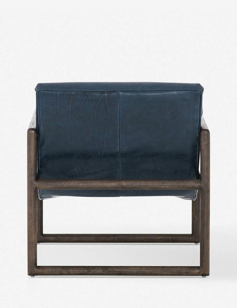 This unique chair plays with shape, combining a curved, low-slung seat and an angular wood frame. Rich leather with deep channeling adds rustic appeal and the deep sapphire tone is versatile and chic.
