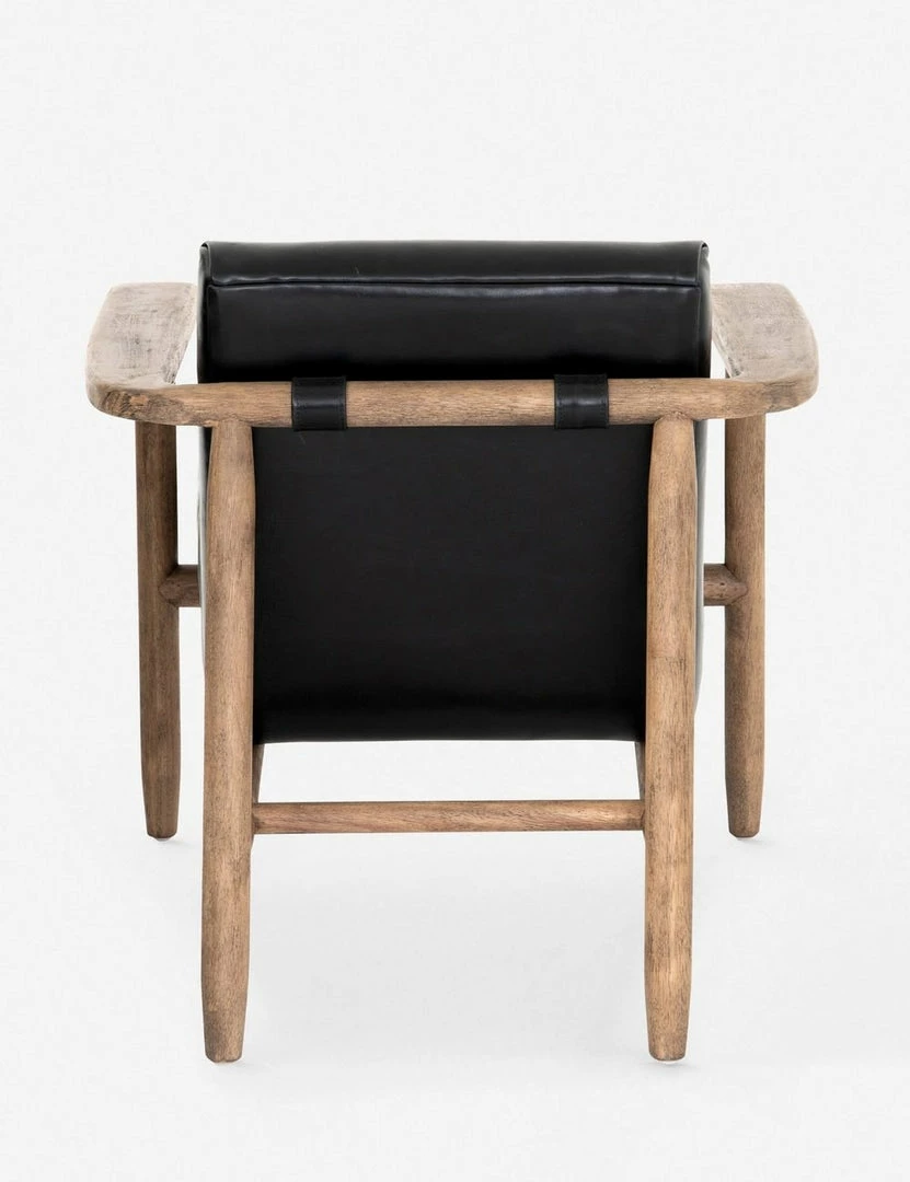 A mid-century modern chair that doesn’t take itself too seriously, featuring a low, angular profile. A distressed wood frame and dowel legs bring a touch of chalet-chic style to the look