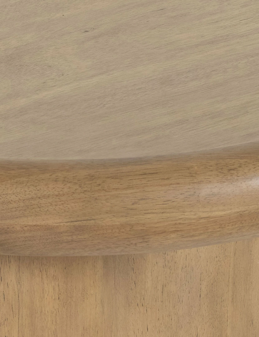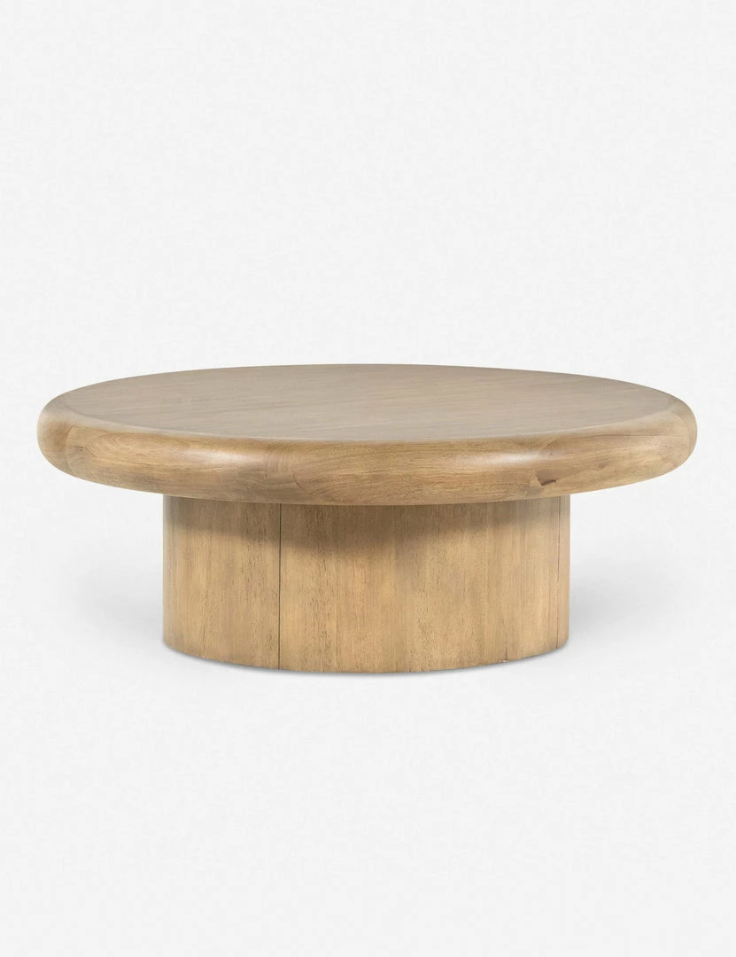 Layer some sculptural appeal into your living space with this sleek coffee table that offers the perfect centerpiece to gather around. The light natural tone of the wood and rounded-edge tabletop balance its pedestal base for a refined aesthetic. Style this wood coffee table with a ceramic vase and greenery to add a fresh, organic touch.
