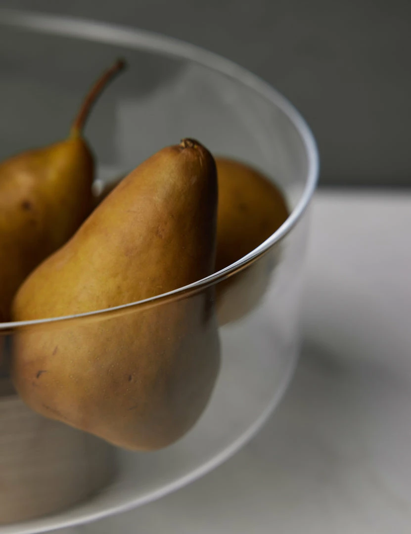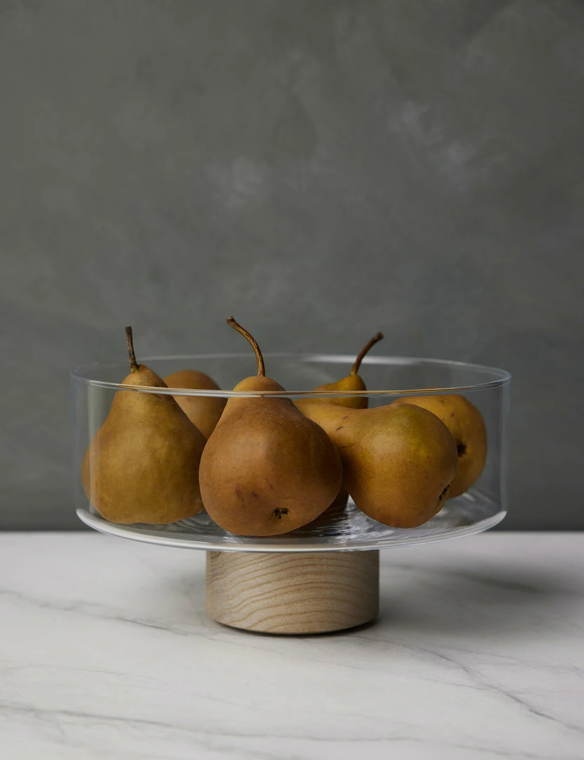 Mouth-blown glass is fitted with an ash wood base to offer clean silhouettes with a warm, natural touch in this centerpiece pedestal bowl. Serve up a dessert, trifle, or fruit with showstopping appeal in this pedestal bowl.