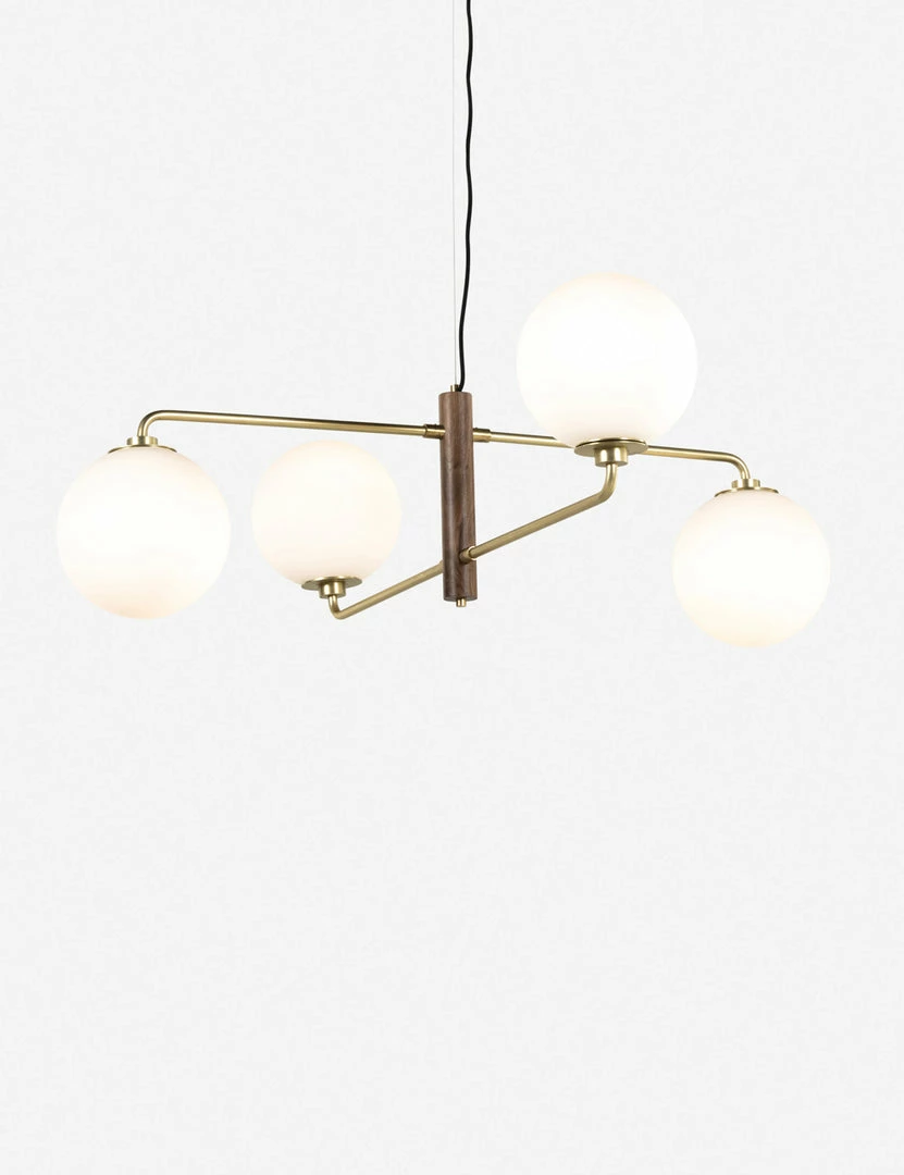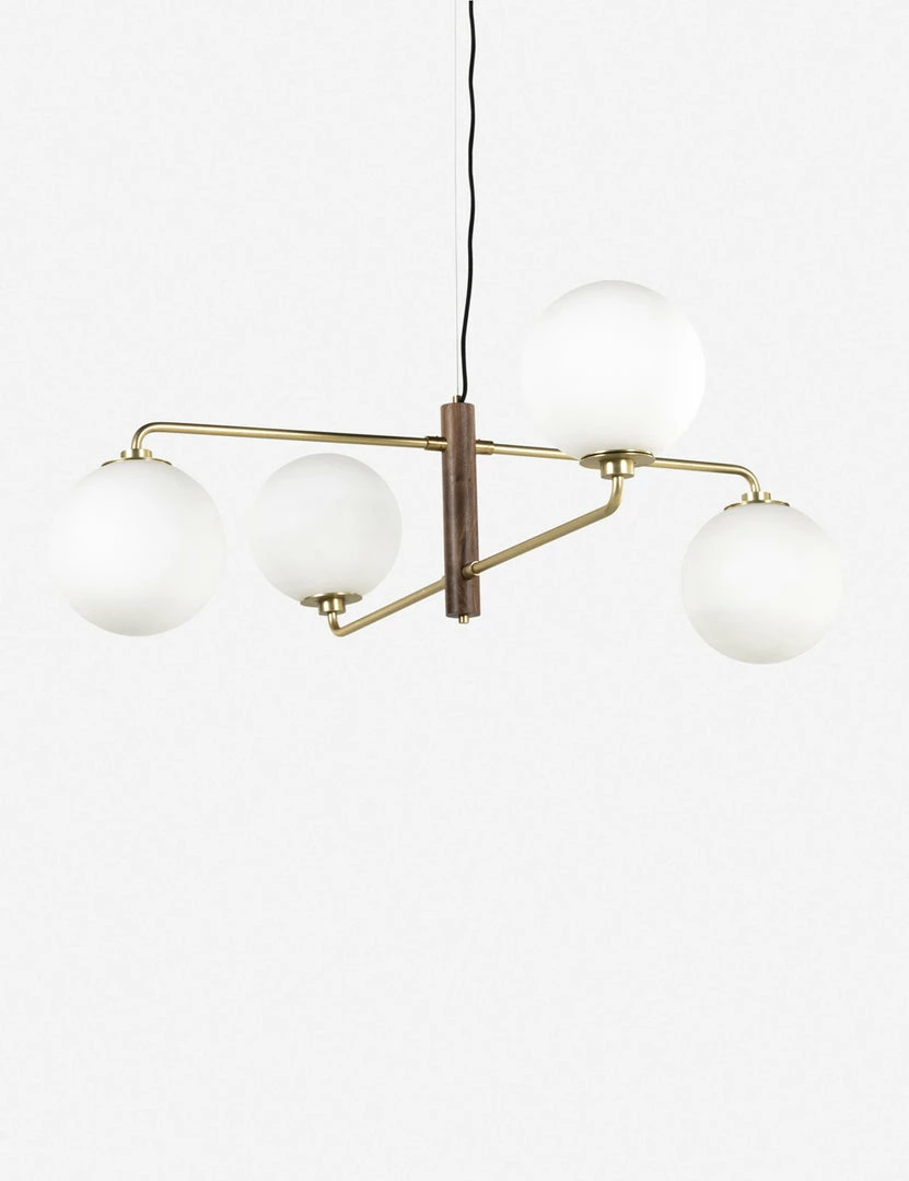 Mixing solid walnut with antique brass finishes, this chandelier offers a warmly modern overhead lighting feature. The glass globes cast a beautifully diffused light completing this eye-catching chandelier design with an inviting glow.