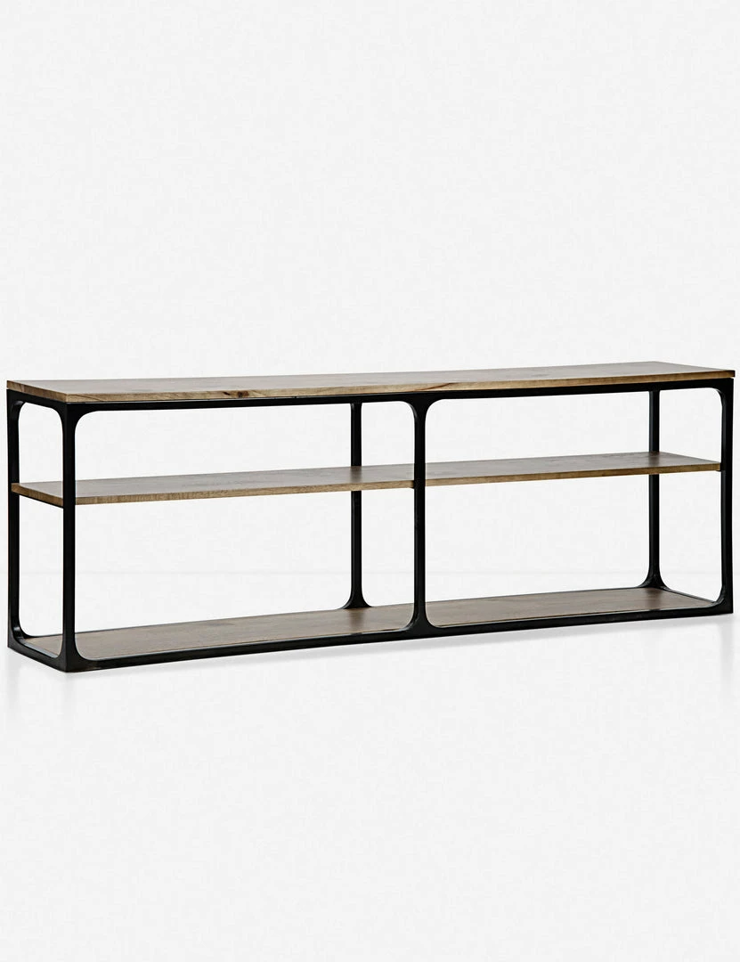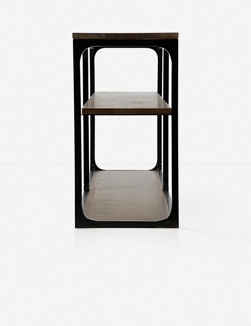 With a cool industrial feel, this console table offers a unique way to display your favorite accessories without compromising your rustic-modern style. Distressed black metal and dark walnut wood shelves are the perfect compliment to your space.
