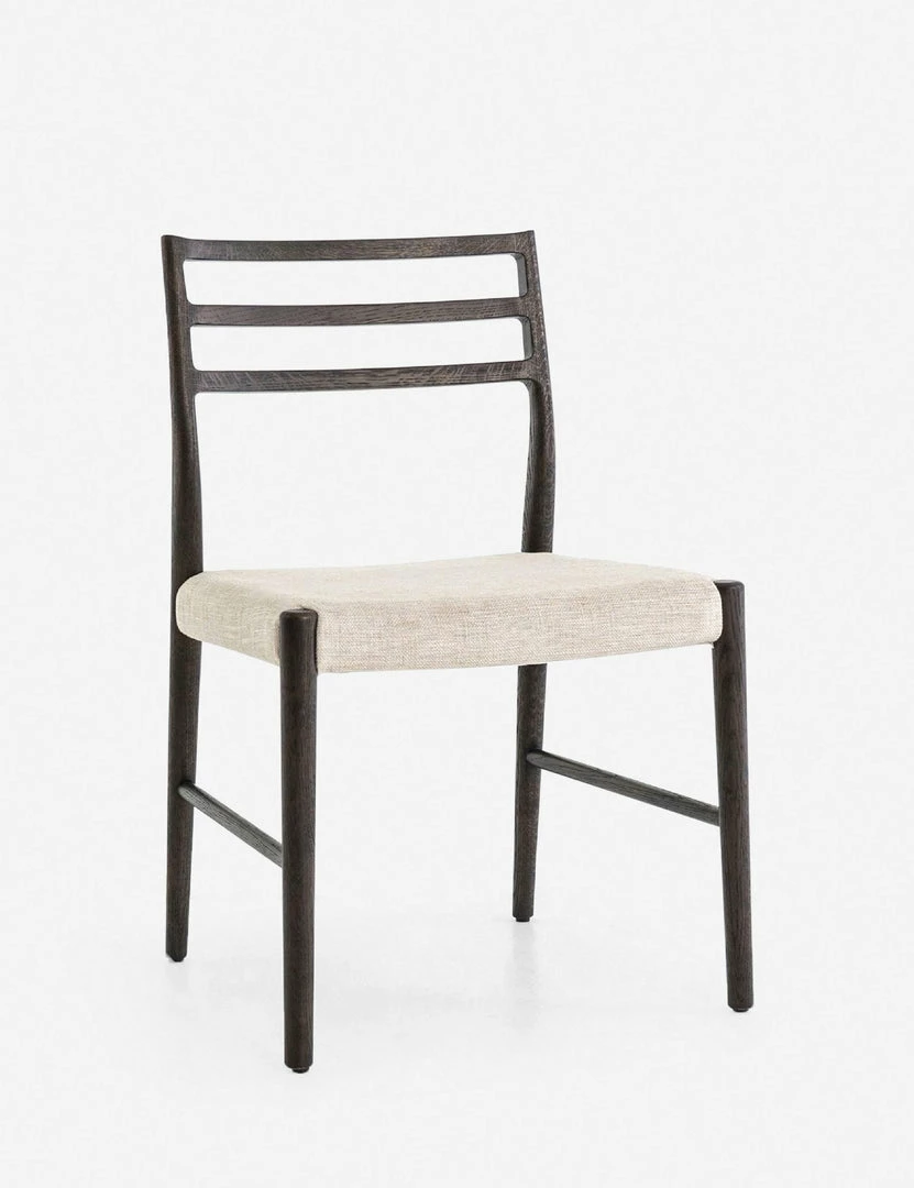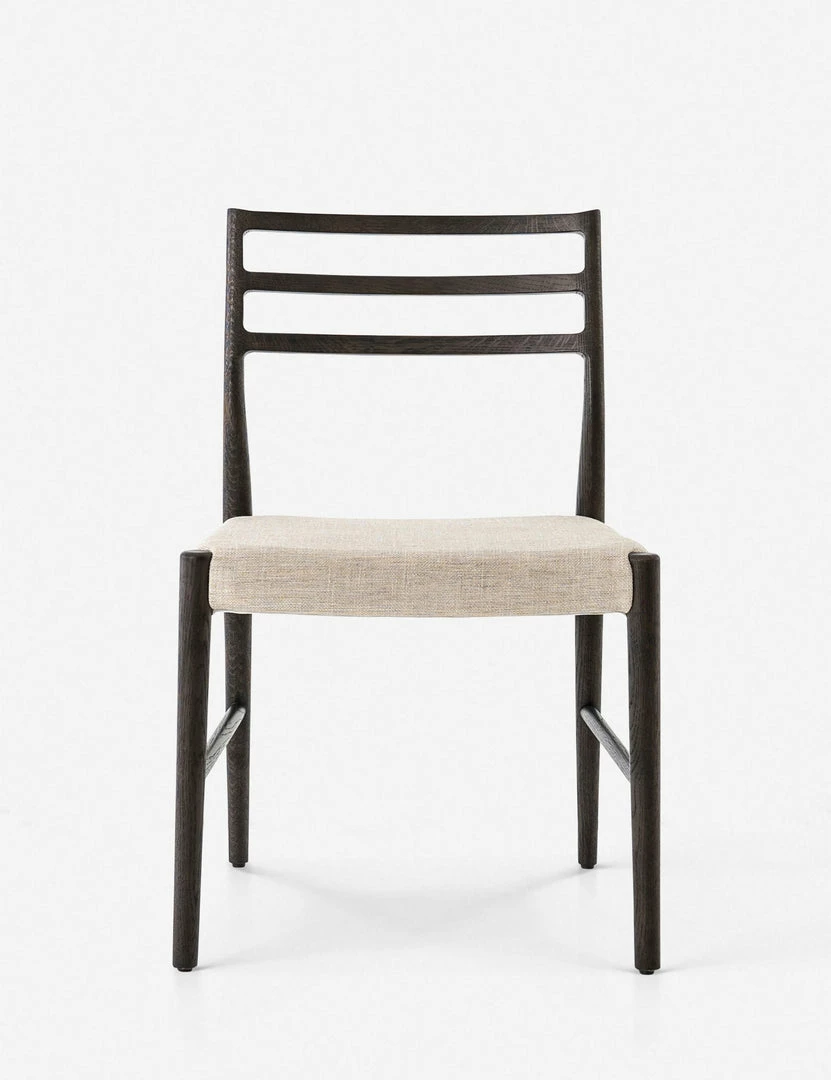 A modern dining chair offering sleek lines in a dark oak finish, complete with a natural fabric seat for a versatile look that won’t overpower your space. Its understated design makes it the ideal kitchen and dining room chair for either your breakfast nook or main dining room table.