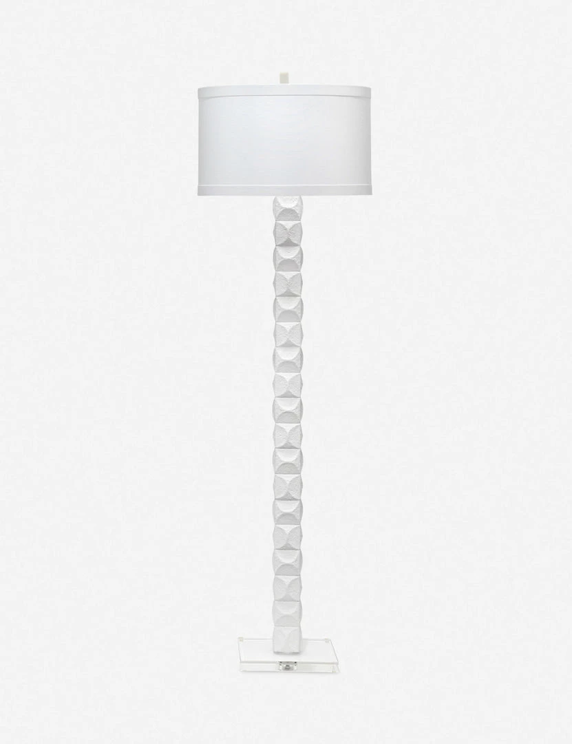 A statement in white, the textured matte finish of this floor lamp offers its sculptural lines organic appeal. Topped with a linen drum shade to complement the stucco-like profile with a smooth, even light, this lamp is the perfect ambient lighting element for a delicate yet casual aesthetic.
