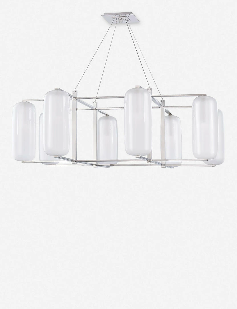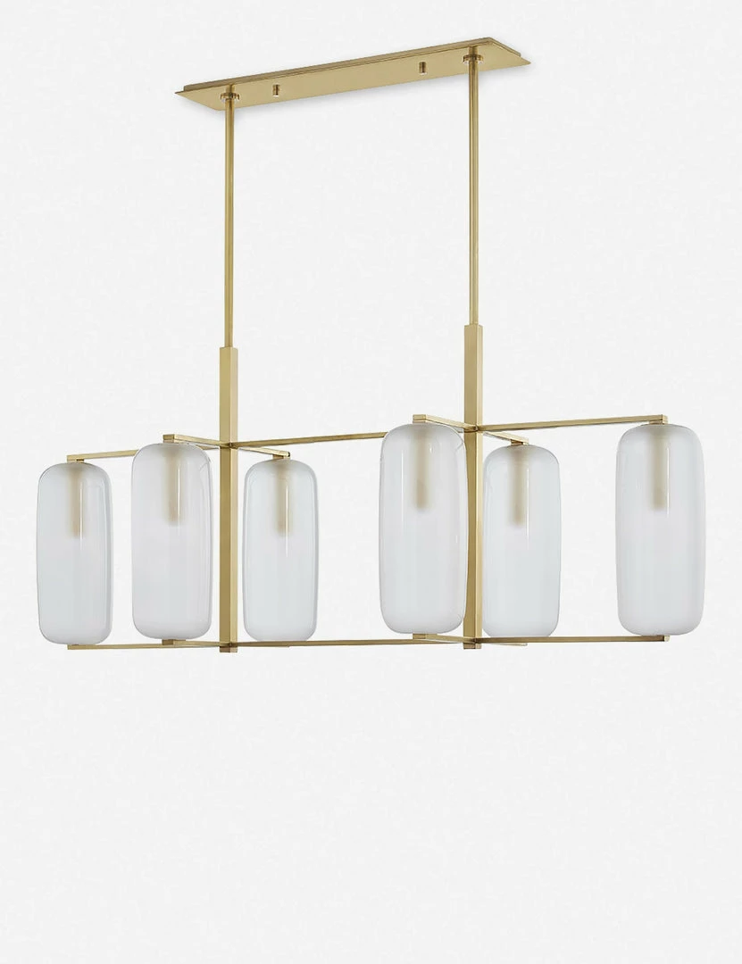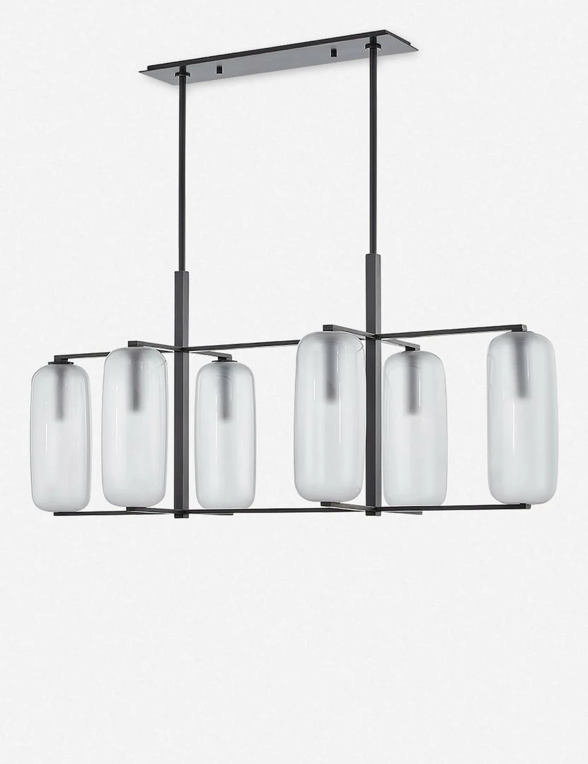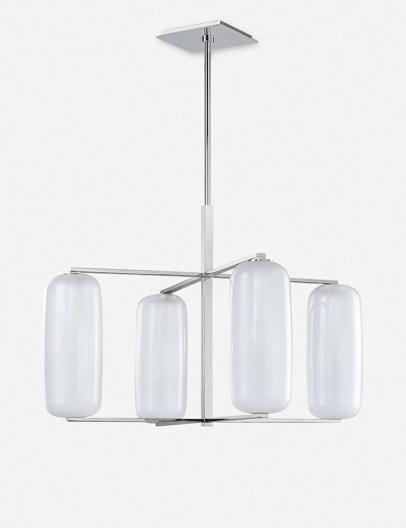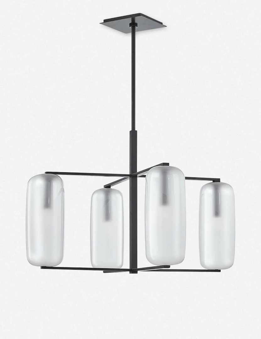 A perfectly transitional style for mid-century spaces. Four pill-shaped frosted glass shades recalls ’60s influence, while crisp lines give the entire look a more modern appeal. Our stylists recommend hanging this pendant above dining room tables, kitchen islands, or in entryways.
