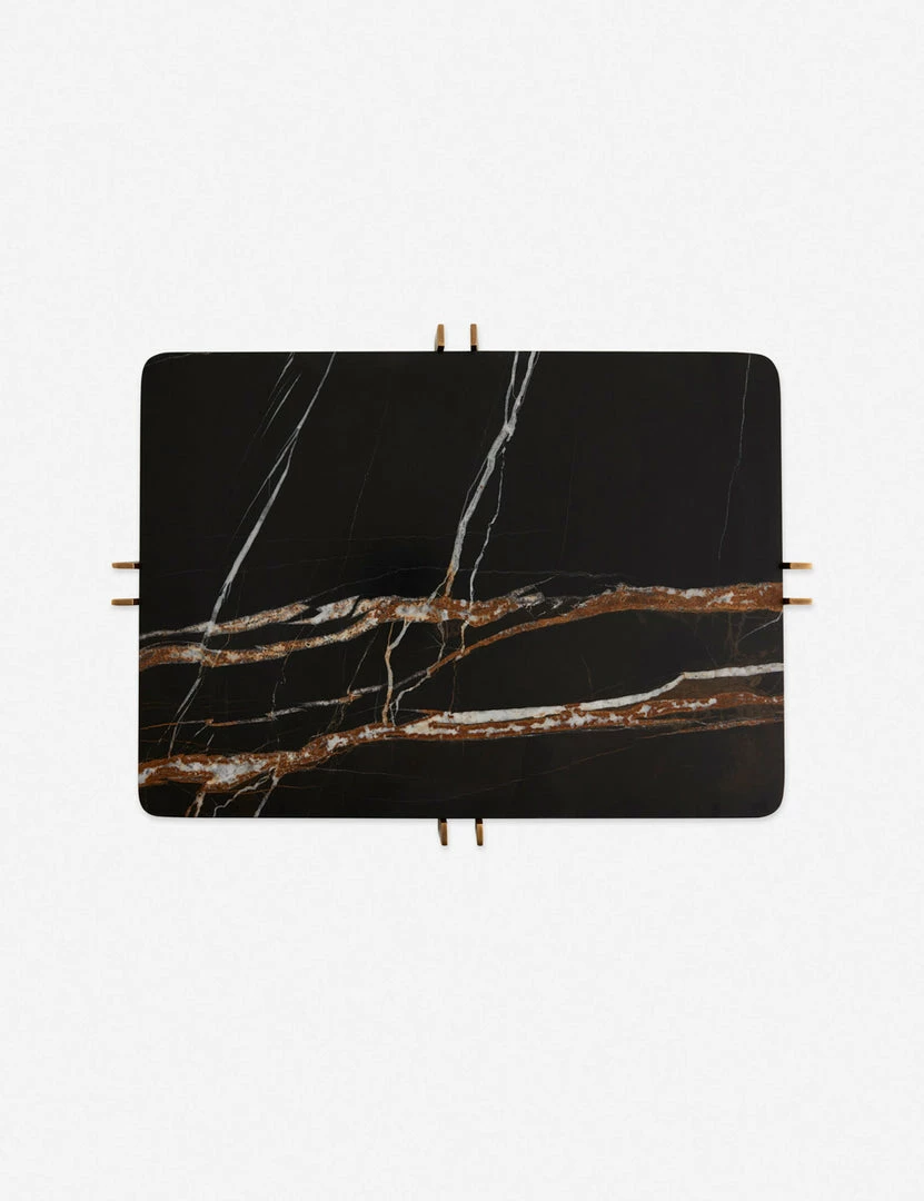 Sleek, modern, and stunningly stylish—this tray features a marble slab set on a streamlined metal bass. An antique brass finish complements the unique rust-colored veining of the marble for a sleek design with mid-century undertones. Ground your entryway decor or use this tray to hold accessories on your bar or vanity.