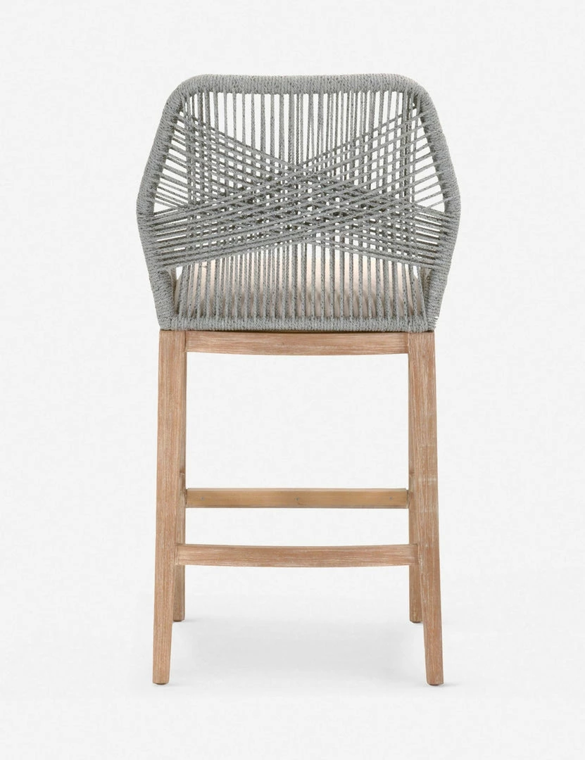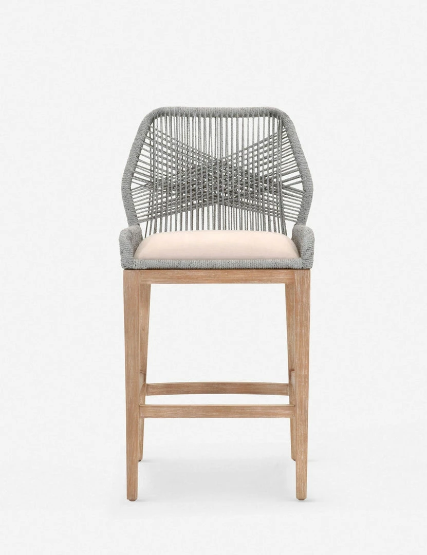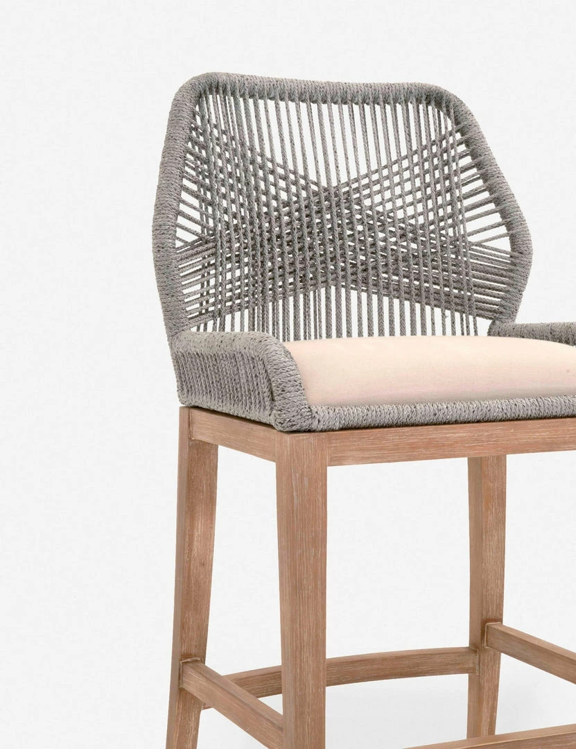 This London bar stool seamlessly combines a unique loom woven design, high-quality mixed materiality, and cozy touches to bring laid-back coastal style to your kitchen, terrace, or patio. A durable and sturdy teak wood base sits below a wrapped aluminum frame that showcases the intricately woven pattern. It is finished with an all-weather cushion in pumice gray for a tonal look.