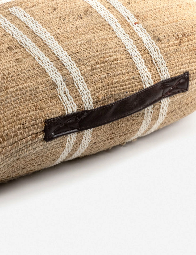 Handwoven from jute and cotton, this versatile floor pillow is grounded in timeless artisan texture set off by a modern cross-striped design. This large decorative pillow can offer a casual touch to your family room or float as spare seating in a dynamic lounge. Leather straps complete the look.