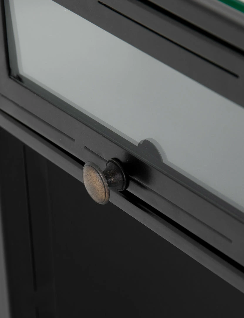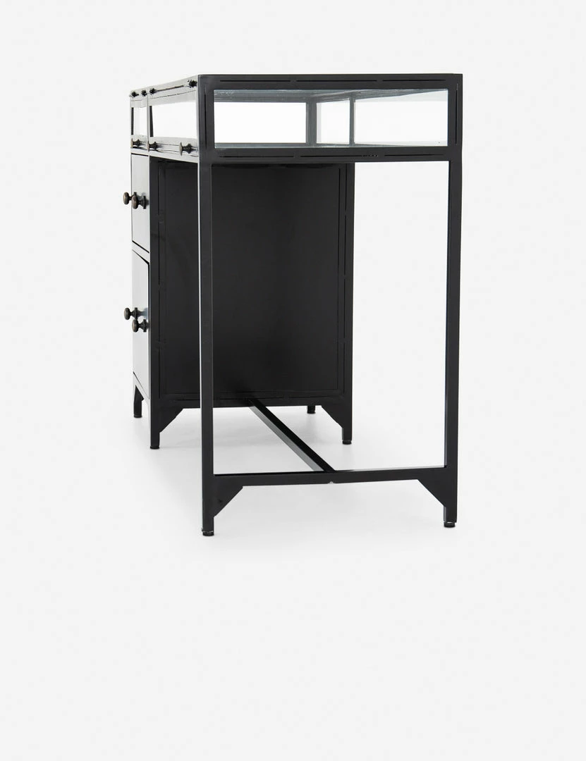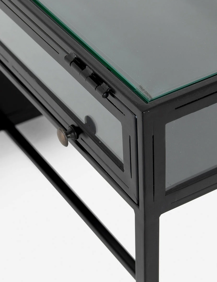 In a sleek nod to a shadow box design, this desk features an iron frame with glass enclosures for storage and display. The Malcom Desk includes a file drawer finished and brass knobs to offer a practical touch with an industrial edge.