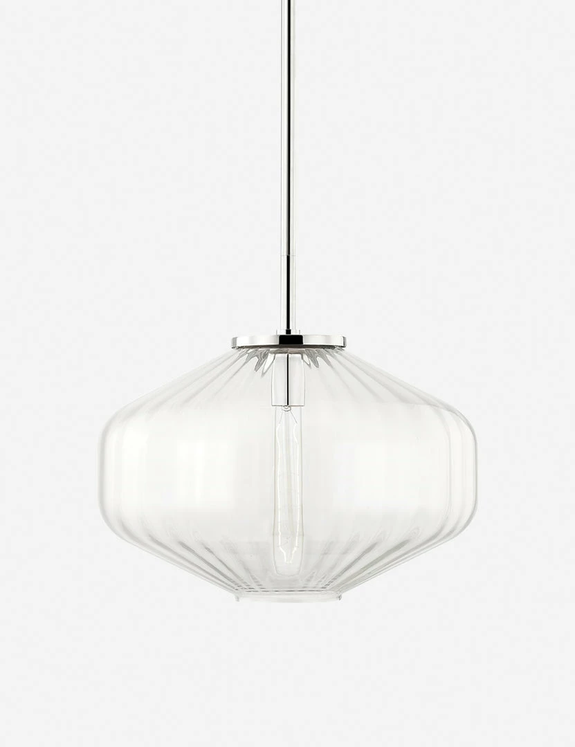 A broad, pleated glass basin and streamlined design offer up radiant lighting with timeless sophistication for this glass pendant light. Both the antique brass and polished nickel finish glints with understated elegance, perfect for an added touch of overhead lighting in an airy, transitional kitchen or entryway.