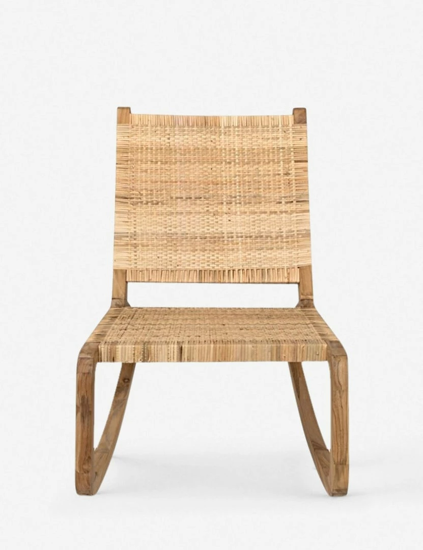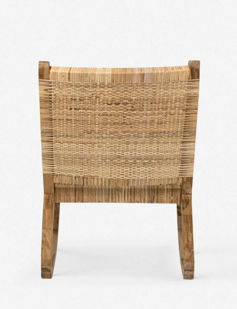 This whimsical occasional chair combines all the charm of an old-world hacienda with a refined twist. The architectural teak rocking base offsets woven rattan elements to create a combination affect that bridges the gap between tailored and casual. Try this accent living room chair in the corner with a floor lamp to create a cozy reading nook.