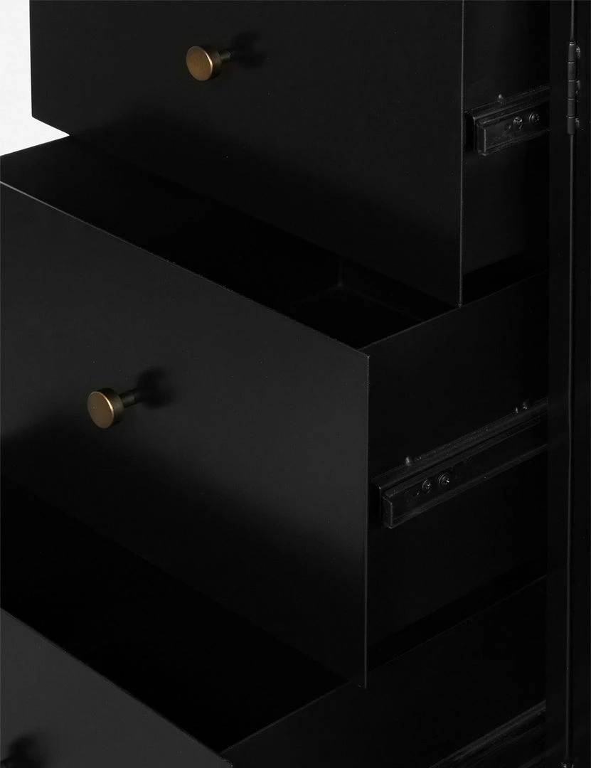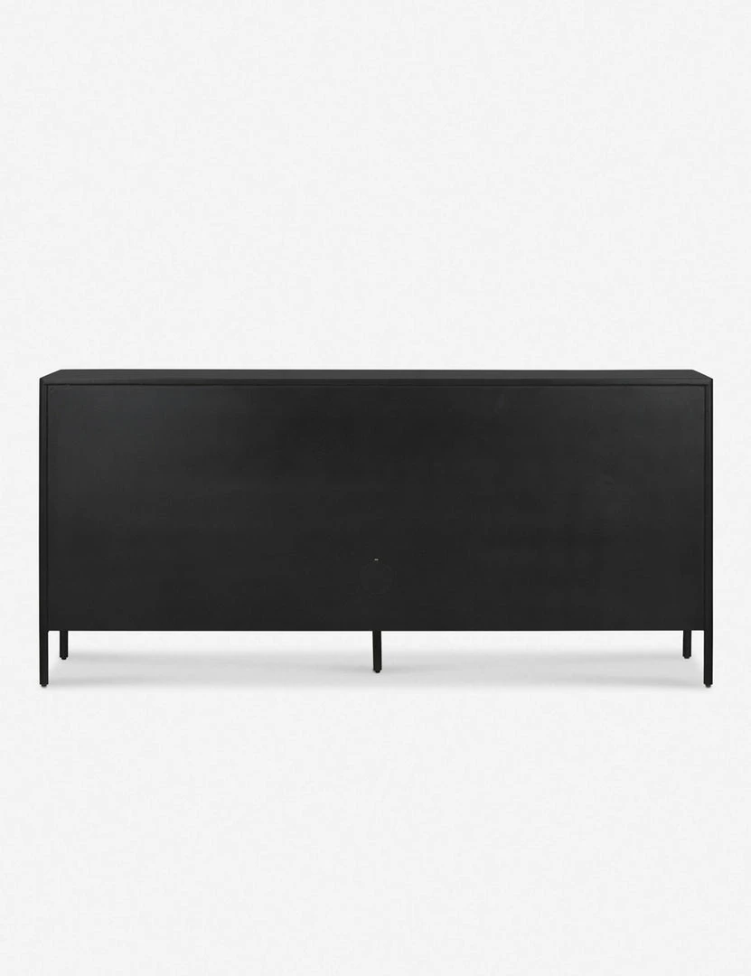 Blending sleek style with industrial undertones, this black-finished iron sideboard cabinet casts a clean, spare silhouette with bronzed hardware for modern appeal. Three drawers and two spacious cabinets offer versatile storage, whether styled in a living room or as a dining room buffet.