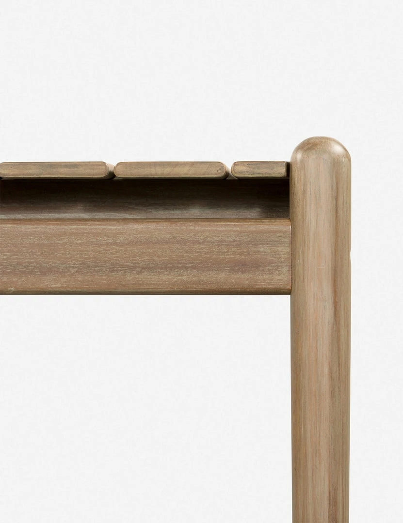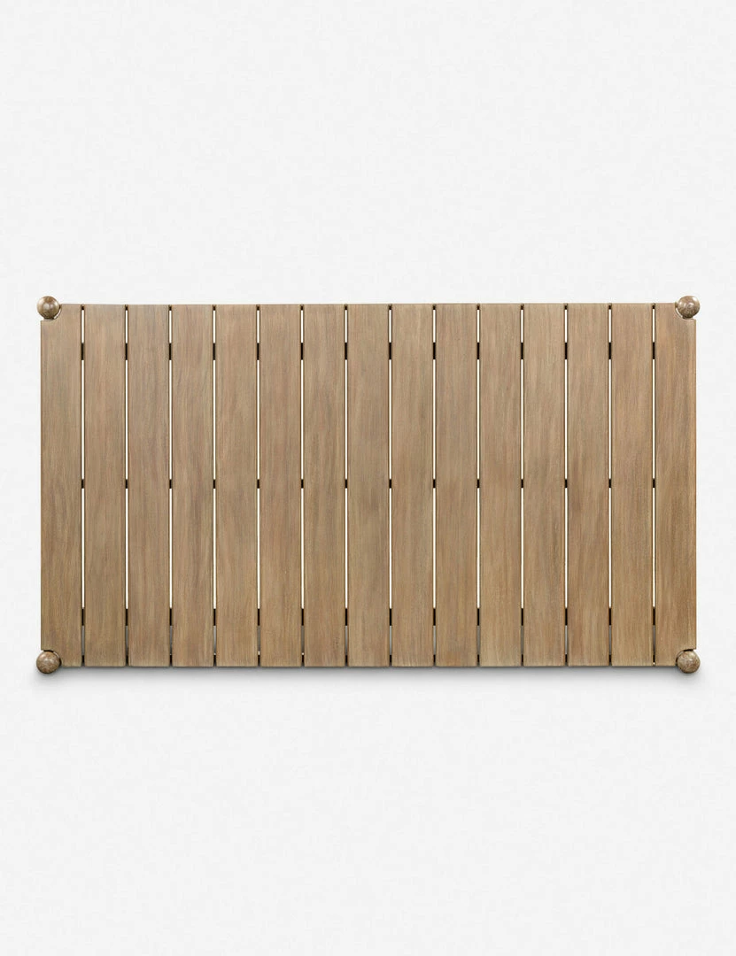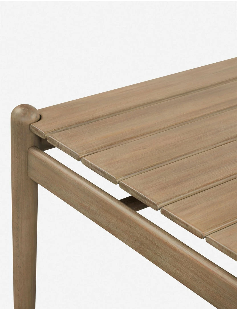 Featuring rounded lines and gently tapered legs, this slatted dining table casts a soft, inviting profile. An outdoor-friendly finish highlights the organic warmth of the wood grain, offering a lightly elevated style that will fold naturally into your dining room or patio.