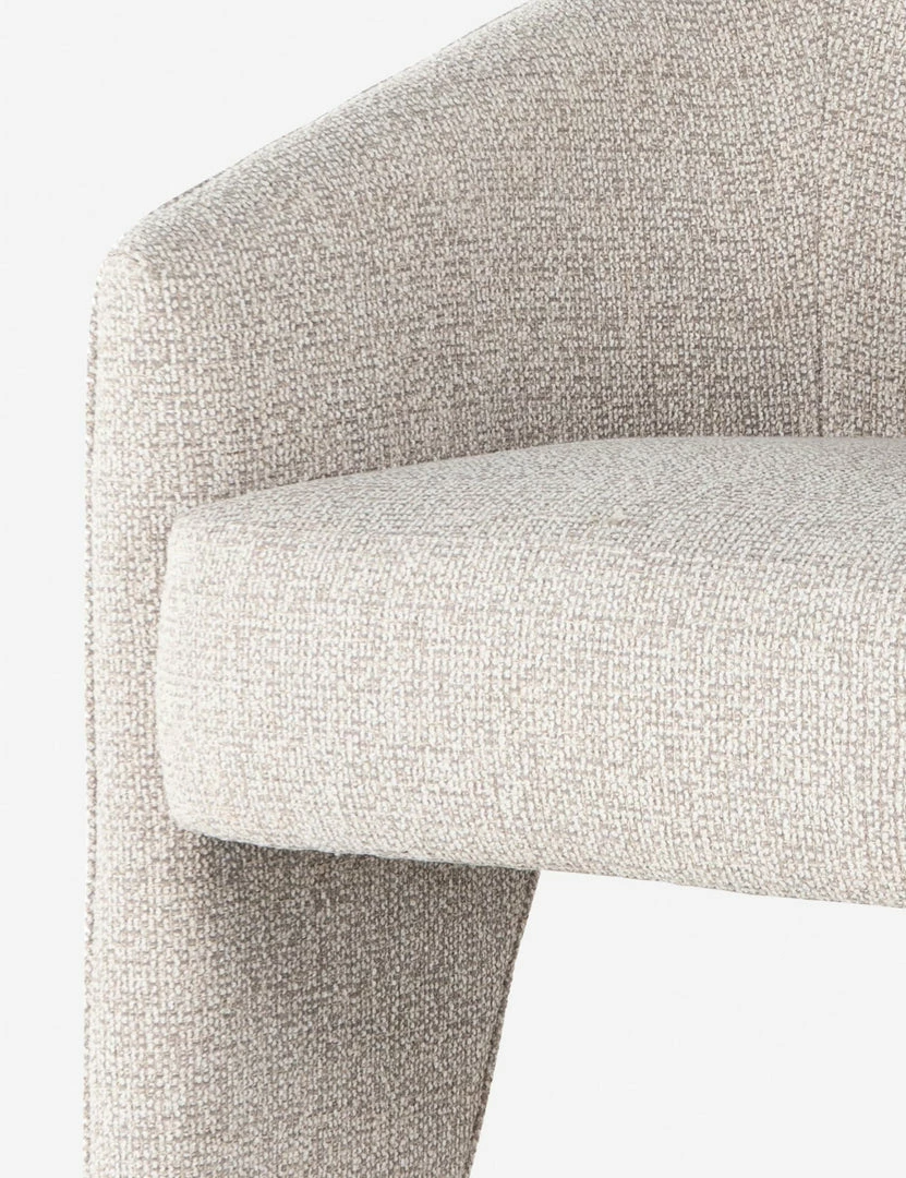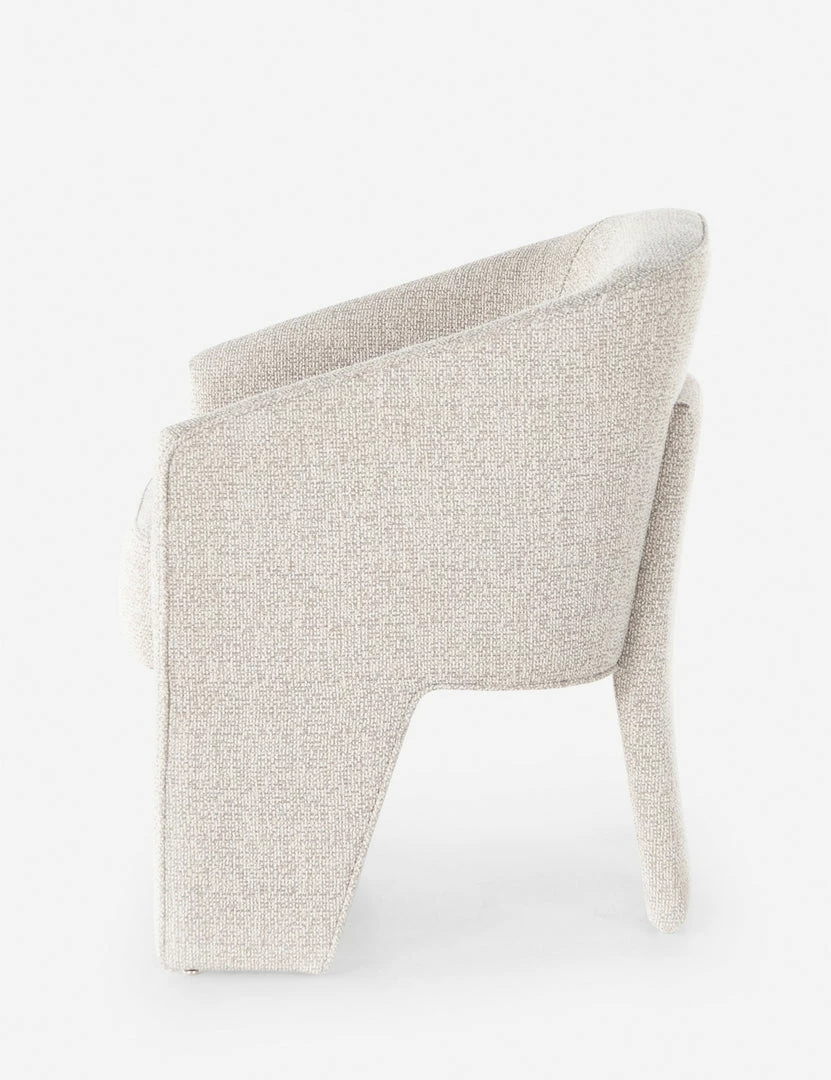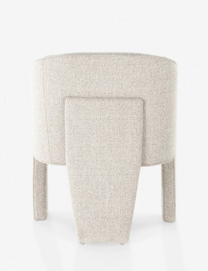 A high performance, bouclé upholstery lends a refined softness to the clean, tailored lines of this dining room chair. Its sculptural form features a unique three-legged design that will bring an elevated touch to a dynamic space. Style this dining chair with an understated, modern dining table for everyday elegance.
