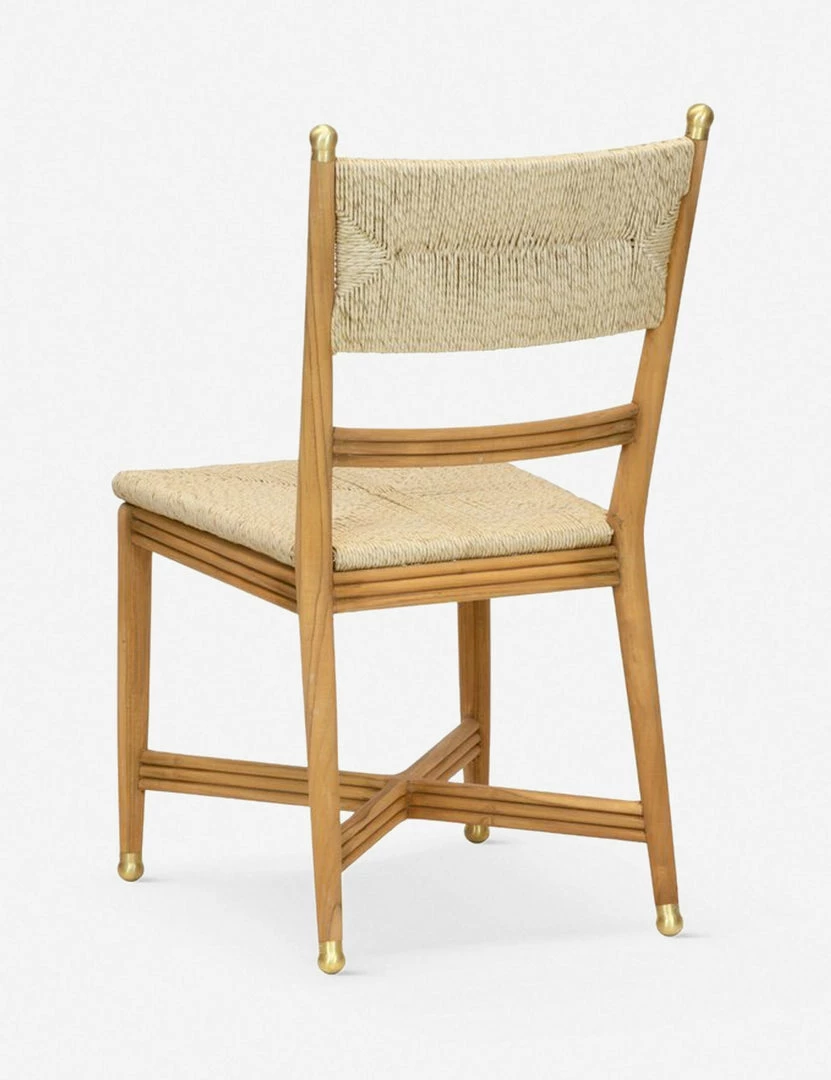 Constructed with hand-carved teak, synthetic twisted hyacinth and brass-capped hardware, the Kelmscott side chair receives influence from Kelmscott Manor- Arts & Crafts textile designer William Morris’s idyllic countryside home in Oxfordshire England- and is a contemporary reenvision of Morris & Co.’s most recognizable design created in the late 19th century, the Rush Sussex Chair. Inspired from Morris’s vision of furniture that strongly highlights form and craftsmanship, this piece will bring enduring charm to the room. Pairs perfectly with the Auberon farmhouse table and bench. Can bbe used in both indoor and outdoor spaces.