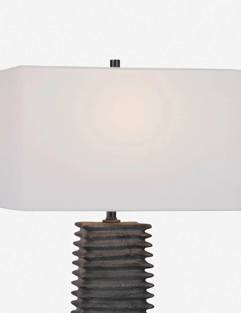 Deeply ribbed with a metallic charcoal glaze, this ceramic table lamp is all about statement-making style with organic textures.
