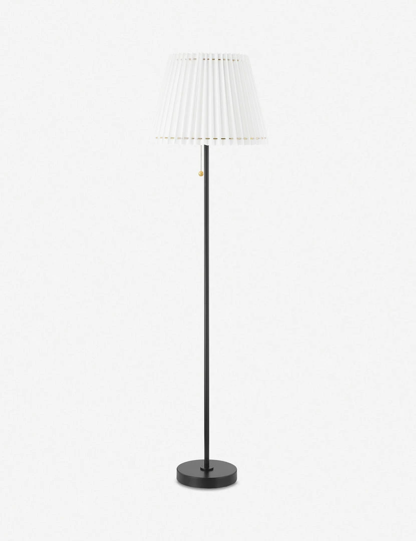 Blending timeless notes with a modern design, this floor lamp features a sleek base with a pleated shade for a chicly balanced profile. Metal rings thread the pleated shade at top and bottom, adding a touch of glamour to this tall lamp—create a reading nook or add some stylish flair to your bedroom lighting.
