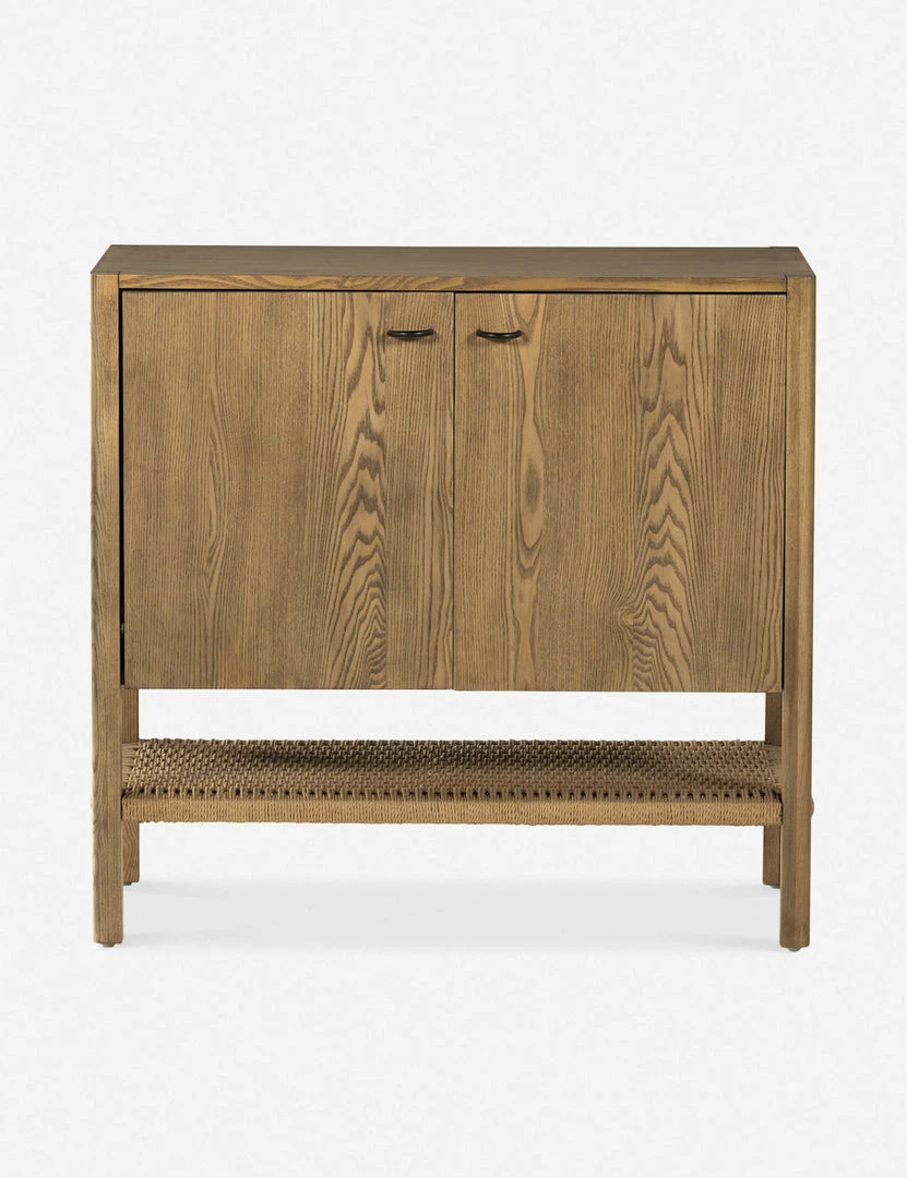 A clean-cut, ash wood design brings Danish-inspired warmth to this Laird cabinet. Iron arch pulls complete the look, while a woven cord shelf offers the perfect textural touch. This cabinet provides easy storage and natural grain appeal with a compact footprint for small-space style.