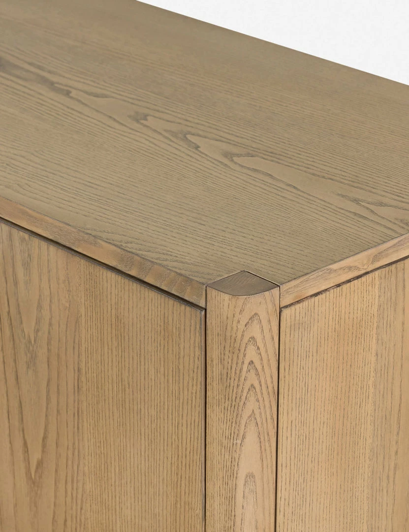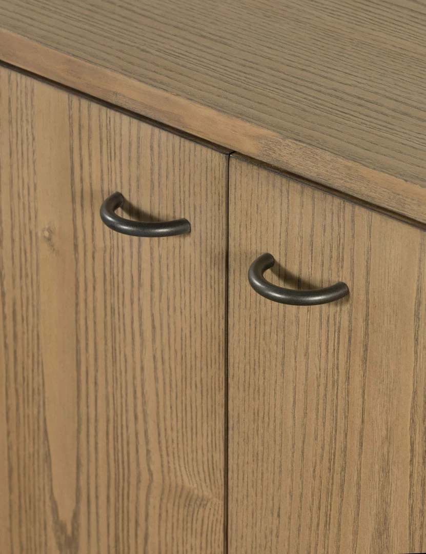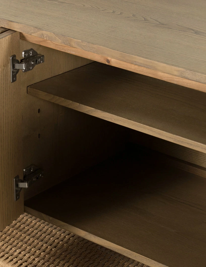 A clean-cut, ash wood design brings Danish-inspired warmth to this Laird sideboard. Iron arch pulls complete the look, while a woven cord shelf offers the perfect textural touch. This sideboard cabinet provides a spacious interior for everyday essentials, plus the open lower shelving is ready for easy storage and display.