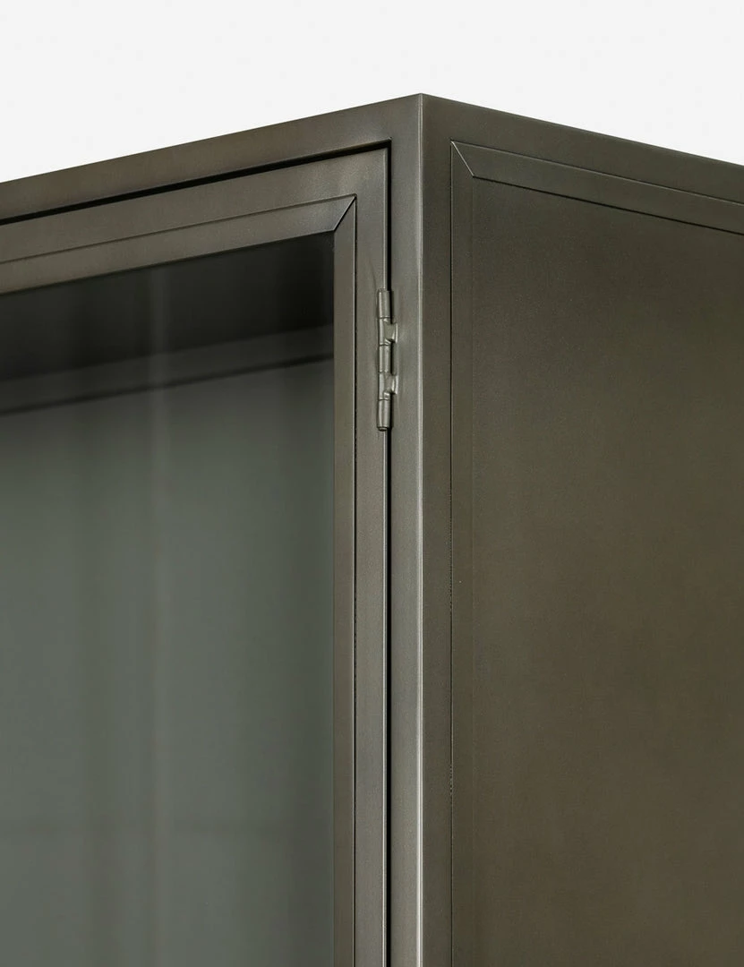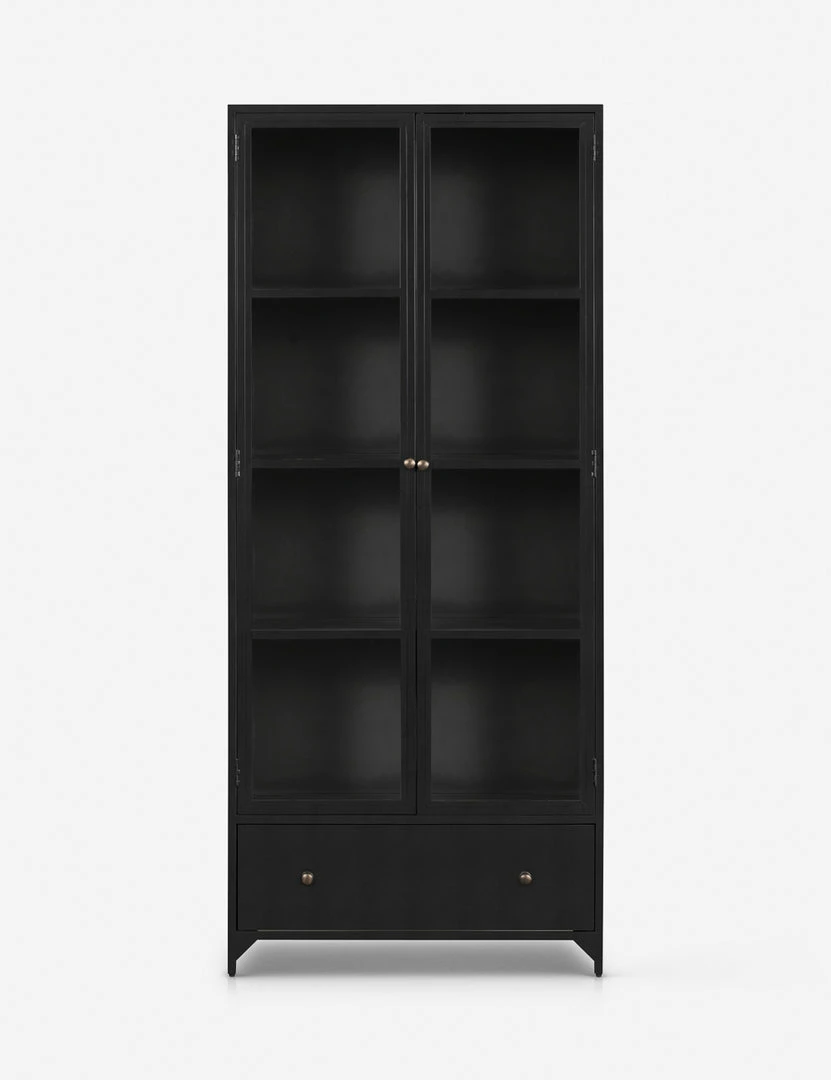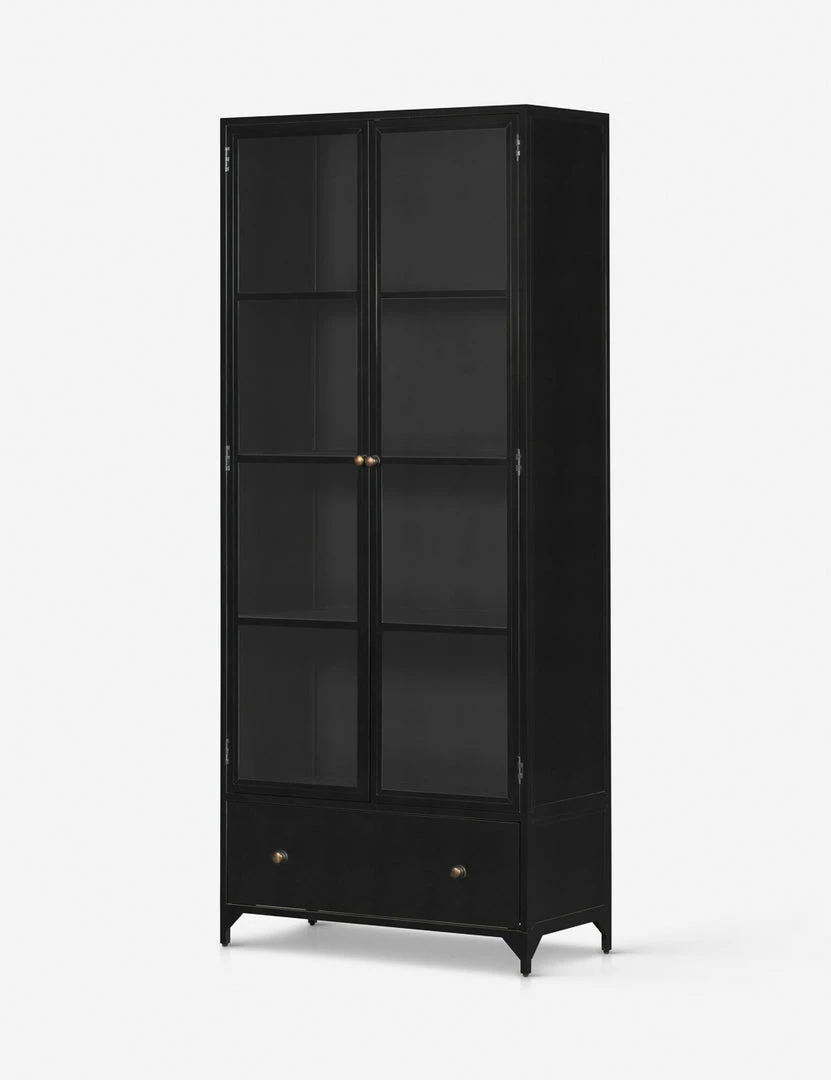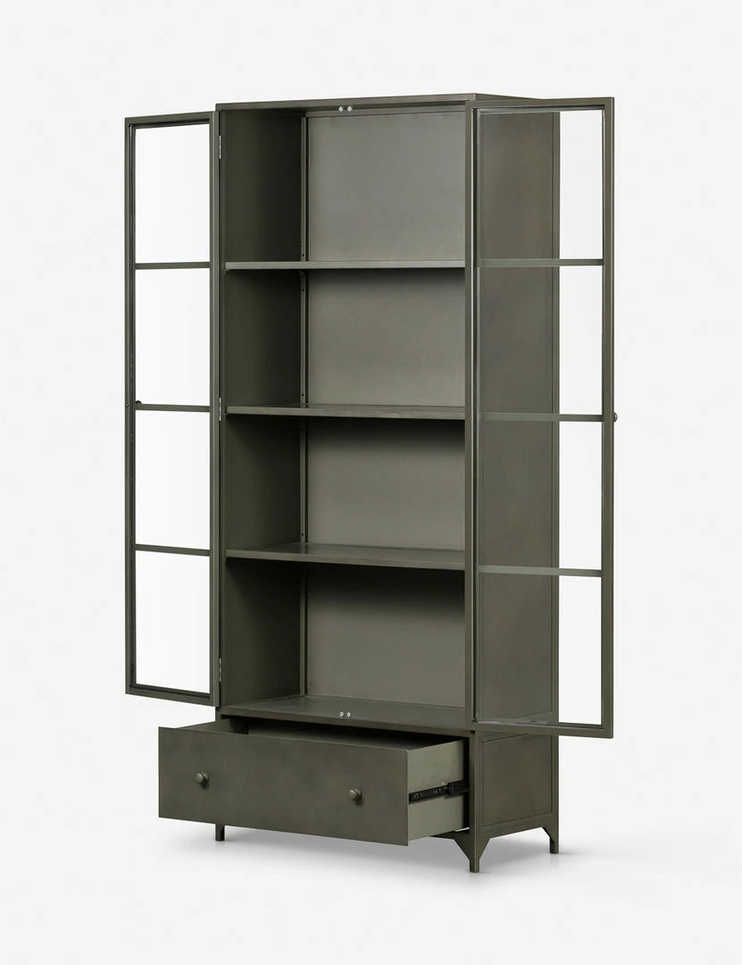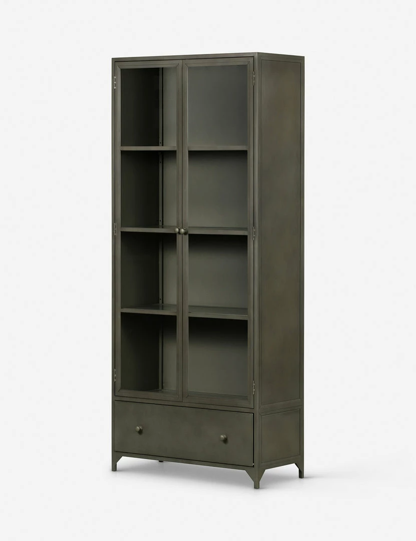 In a sleek nod to a shadow box design, this cabinet features an iron frame with glass doors for storage and display. The Malcom Curio Cabinet offers a low drawer and spacious shelving for a clean look with an industrial edge.