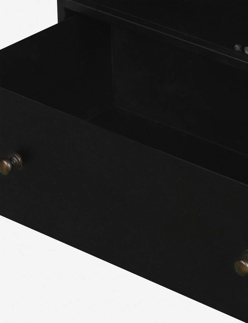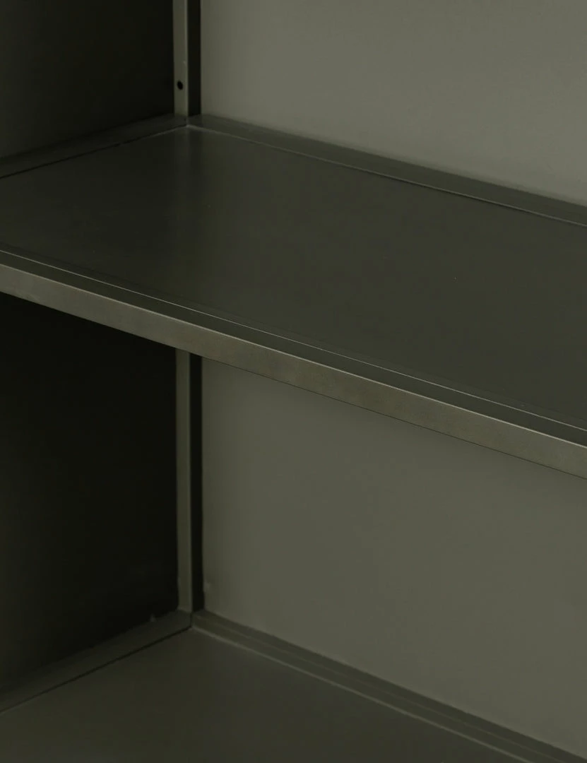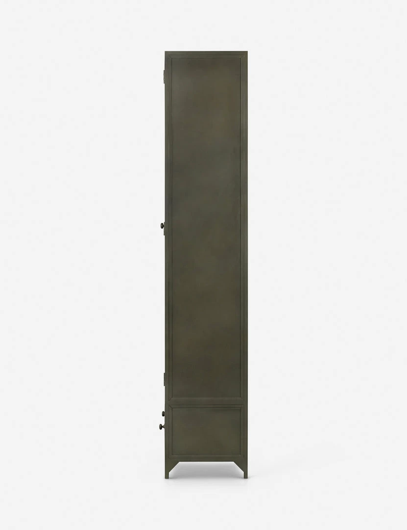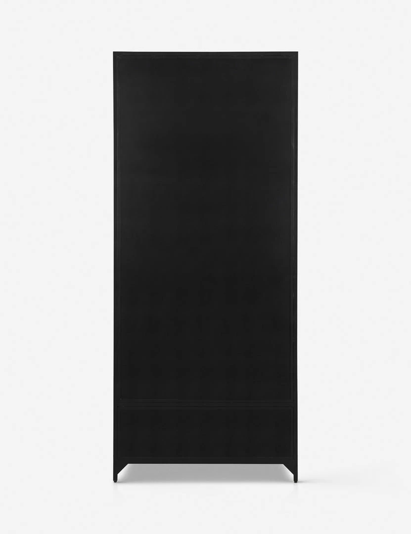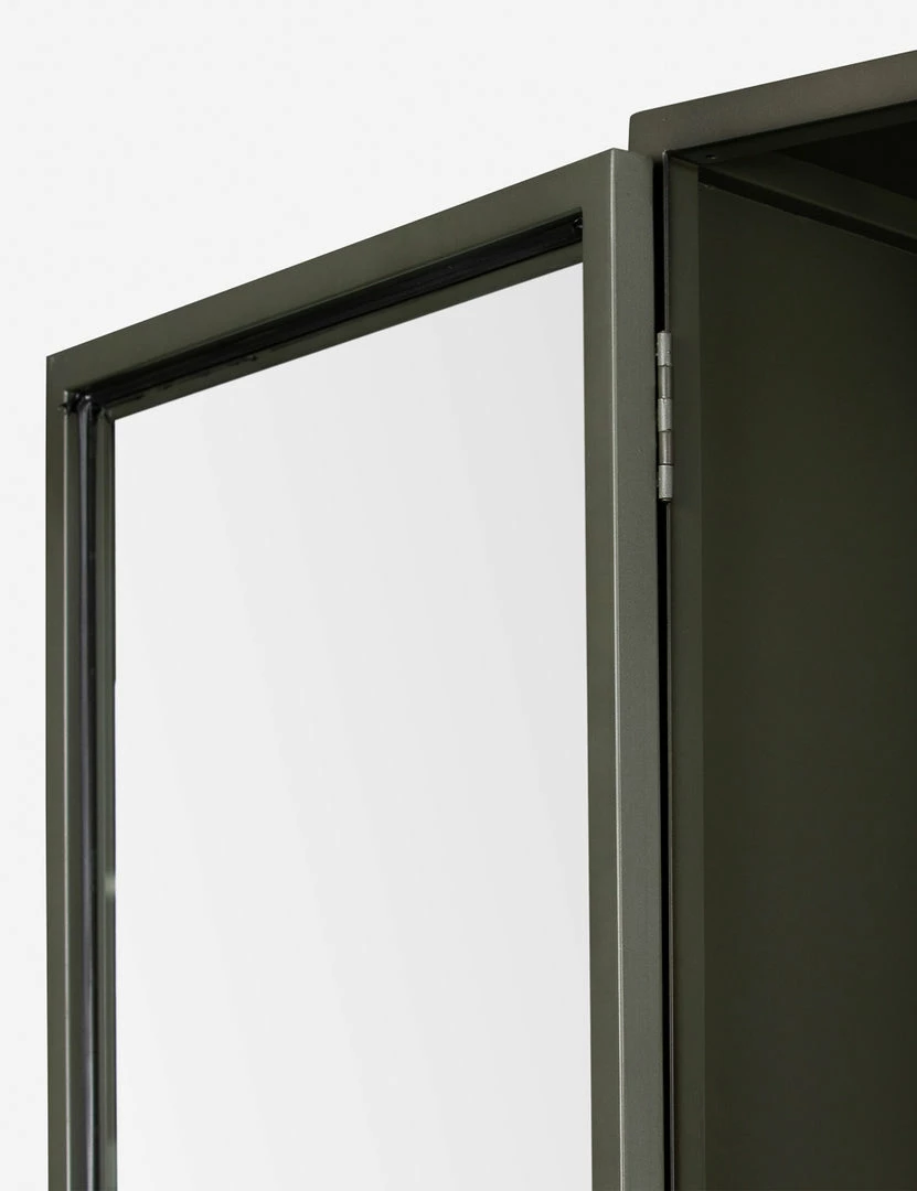 In a sleek nod to a shadow box design, this cabinet features an iron frame with glass doors for storage and display. The Malcom Curio Cabinet offers a low drawer and spacious shelving for a clean look with an industrial edge.