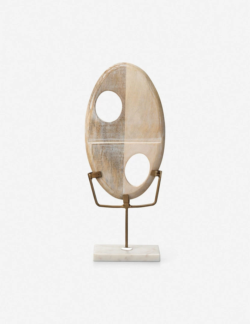 A beautiful accent piece, this rounded wooden tabletop sculpture plays with shape and balance, featuring cutouts and beveled edges suspended over a white marble base. It’s an instantly elegant focal point on consoles and open shelving displays.