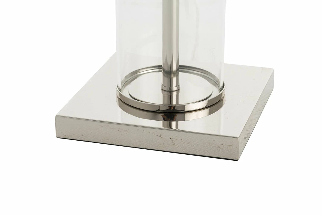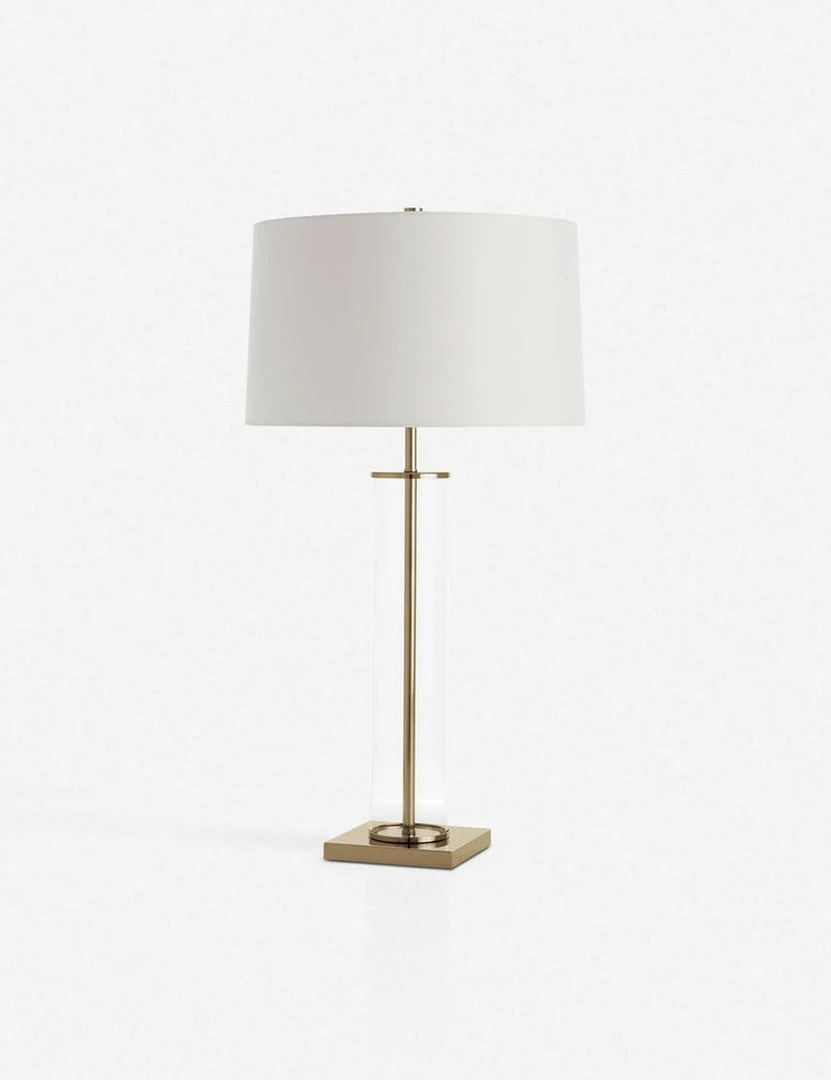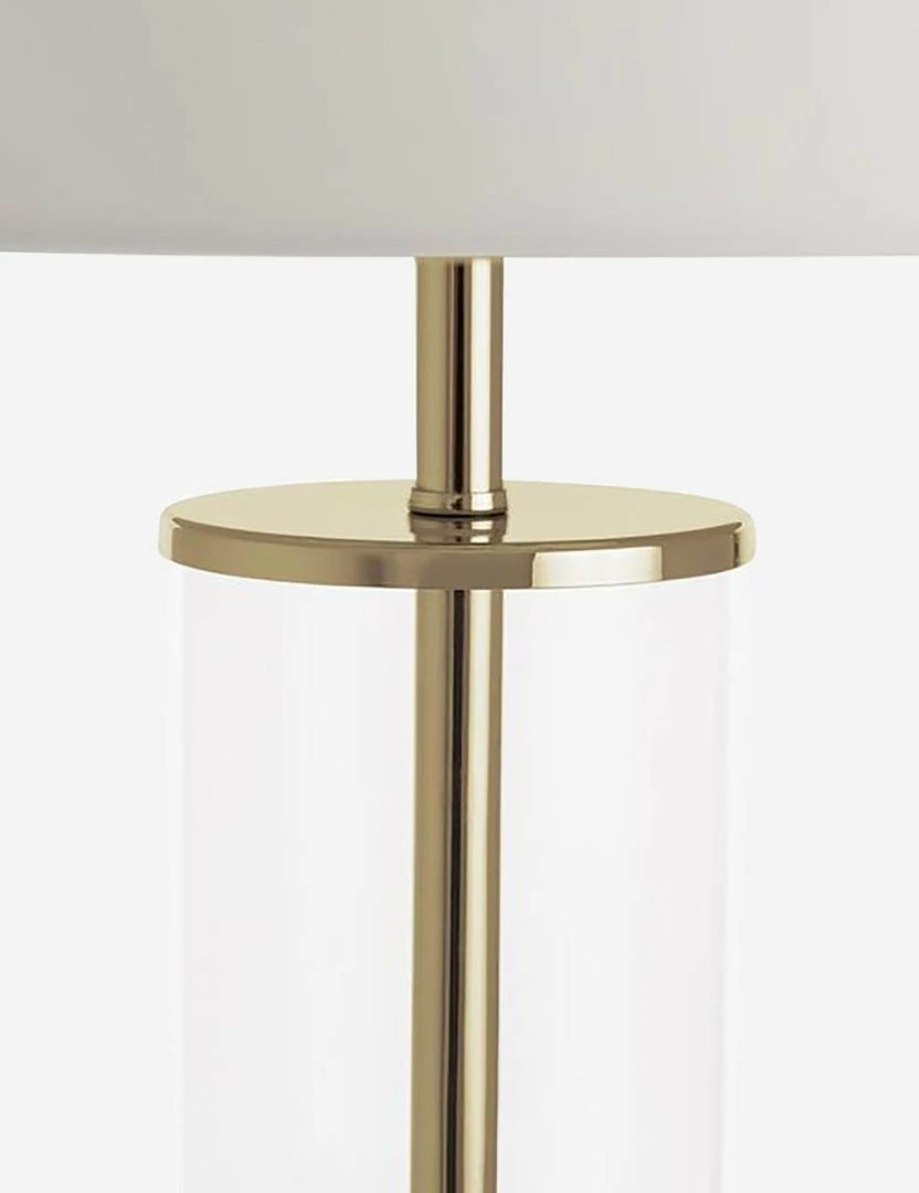 Recalling a timeless elegance, this sleek, chic table lamp gets a modern upgrade with a clear glass cylinder and high-shine hardware. A clean-and-simple white shade completes the look.