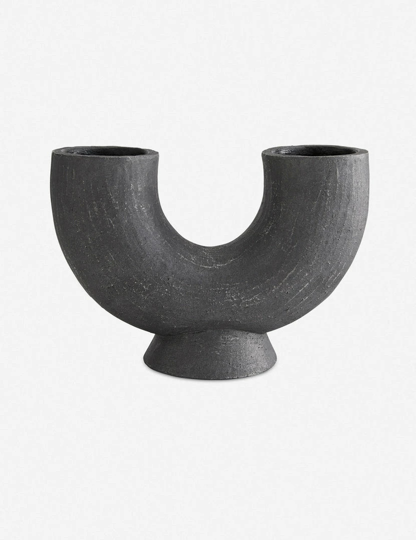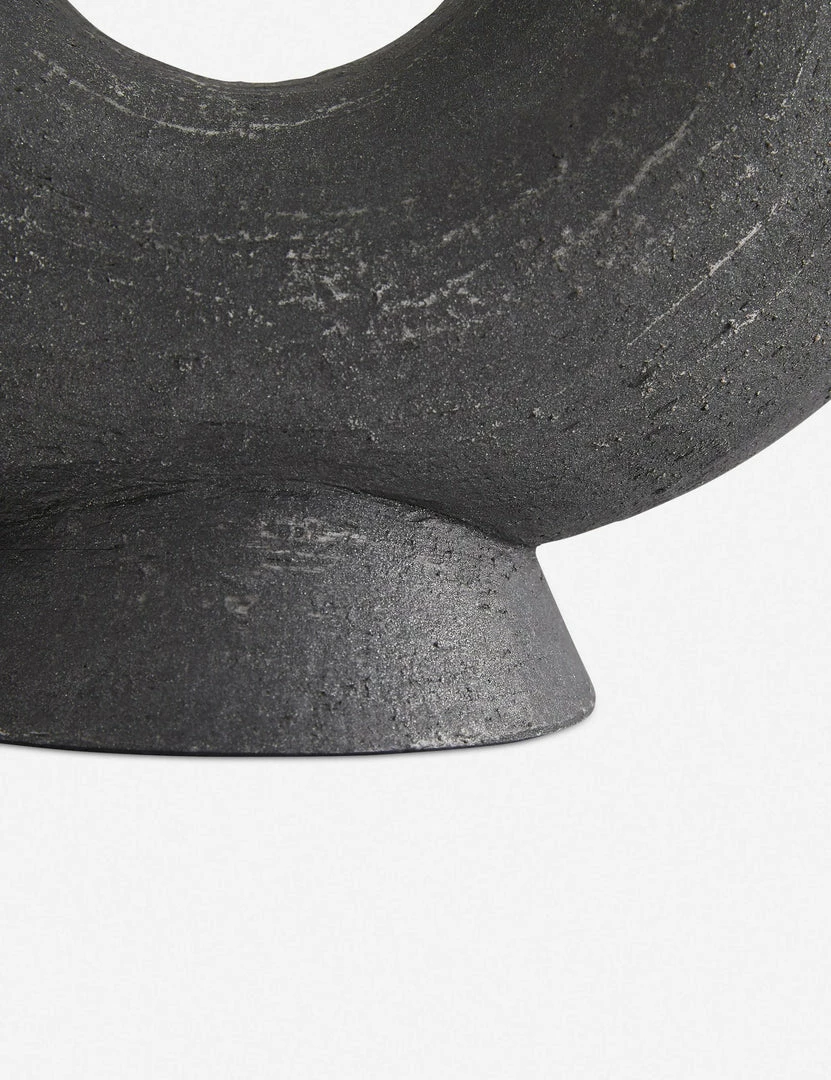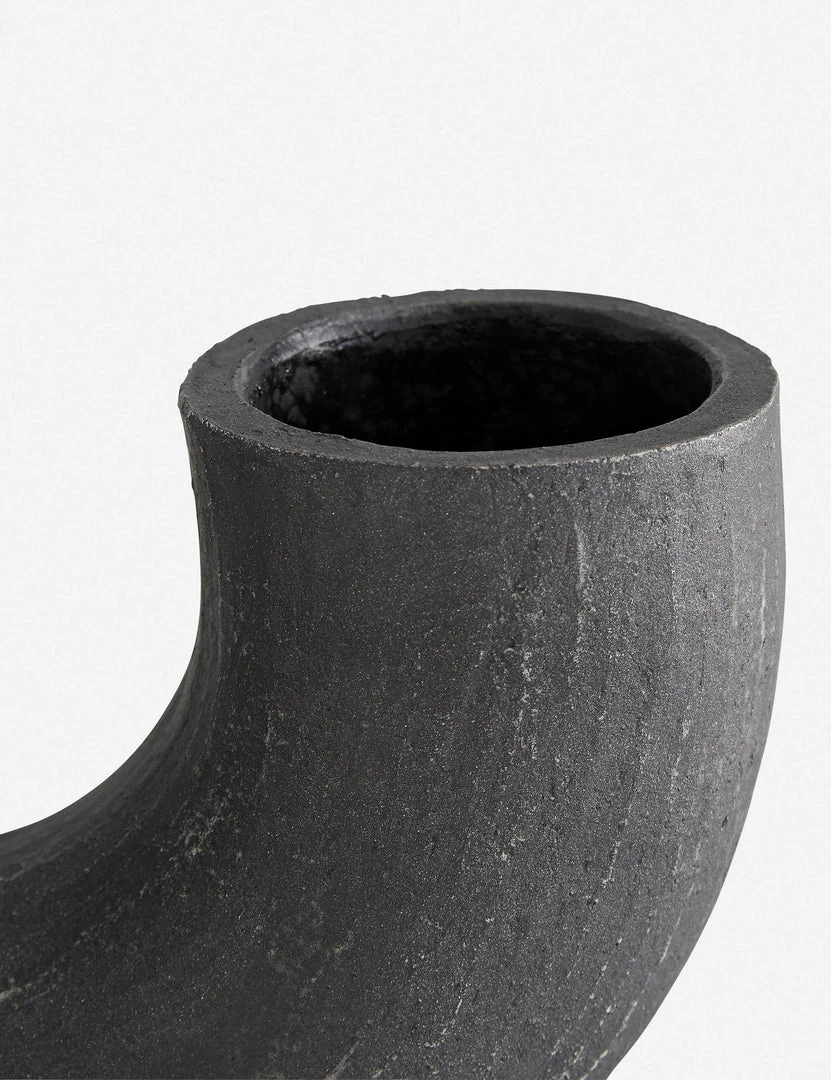 This half-circle table sculpture vase makes a modern statement with its tubular form and matte black glaze. Boasting natural terracotta textures, it’s a stunning addition to any console, coffee table, or home office.