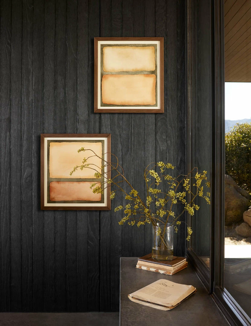 Paired for impact, these watercolor prints are floated in Danish walnut frames to offer tonal depth and texture to your wall decor. Style this wall art set for a sense of unity and balance in a space that blends timeless elements with a modern sensibility.