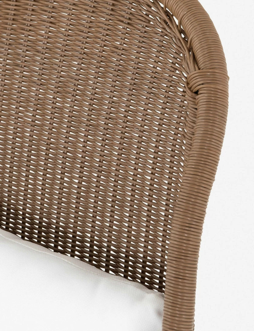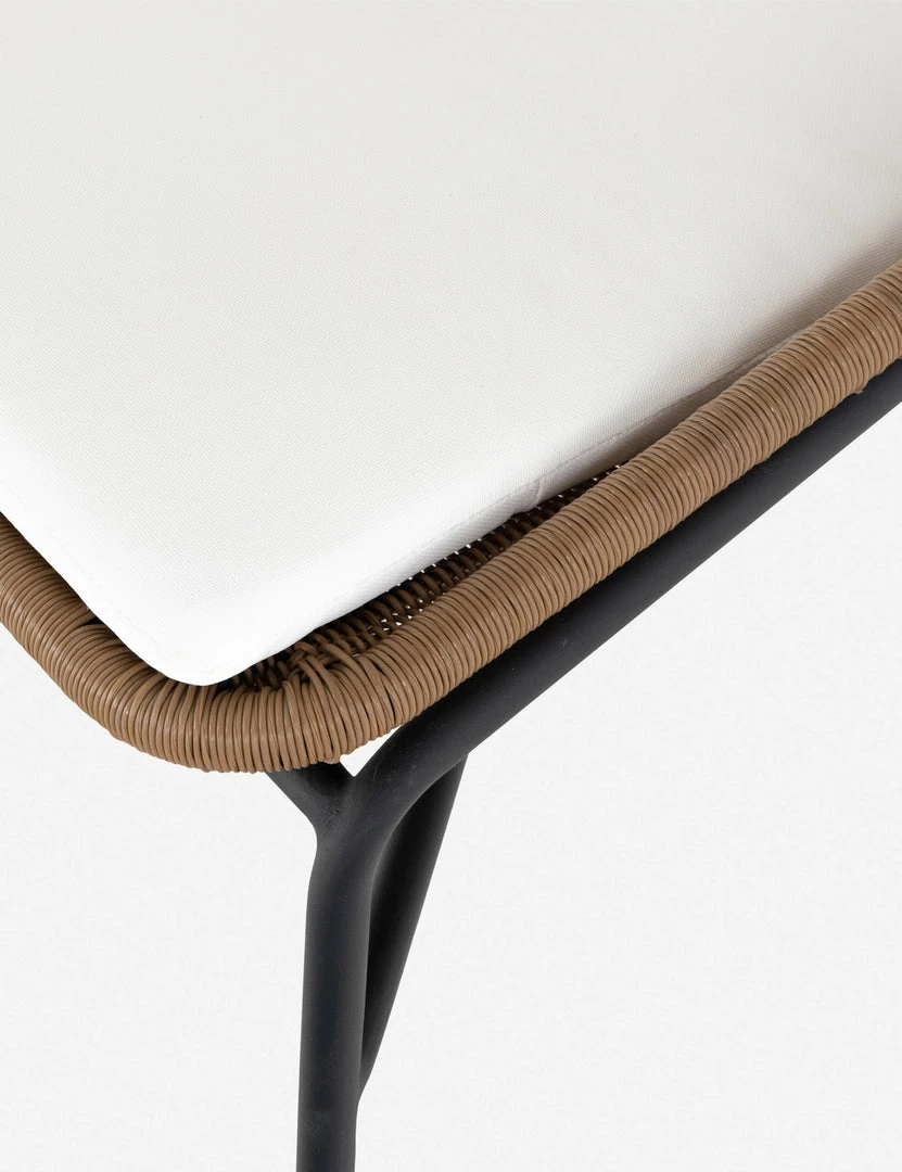 The earthy and moody tones of this dining chair are strikingly constrasted by ivory-colored seat and lumbar cushions. Constructed from a minimal blackened iron base and all-weather wicker seat, this is the perfect chair for dining—whether in a kitchen, or out on your terrace or backyard.