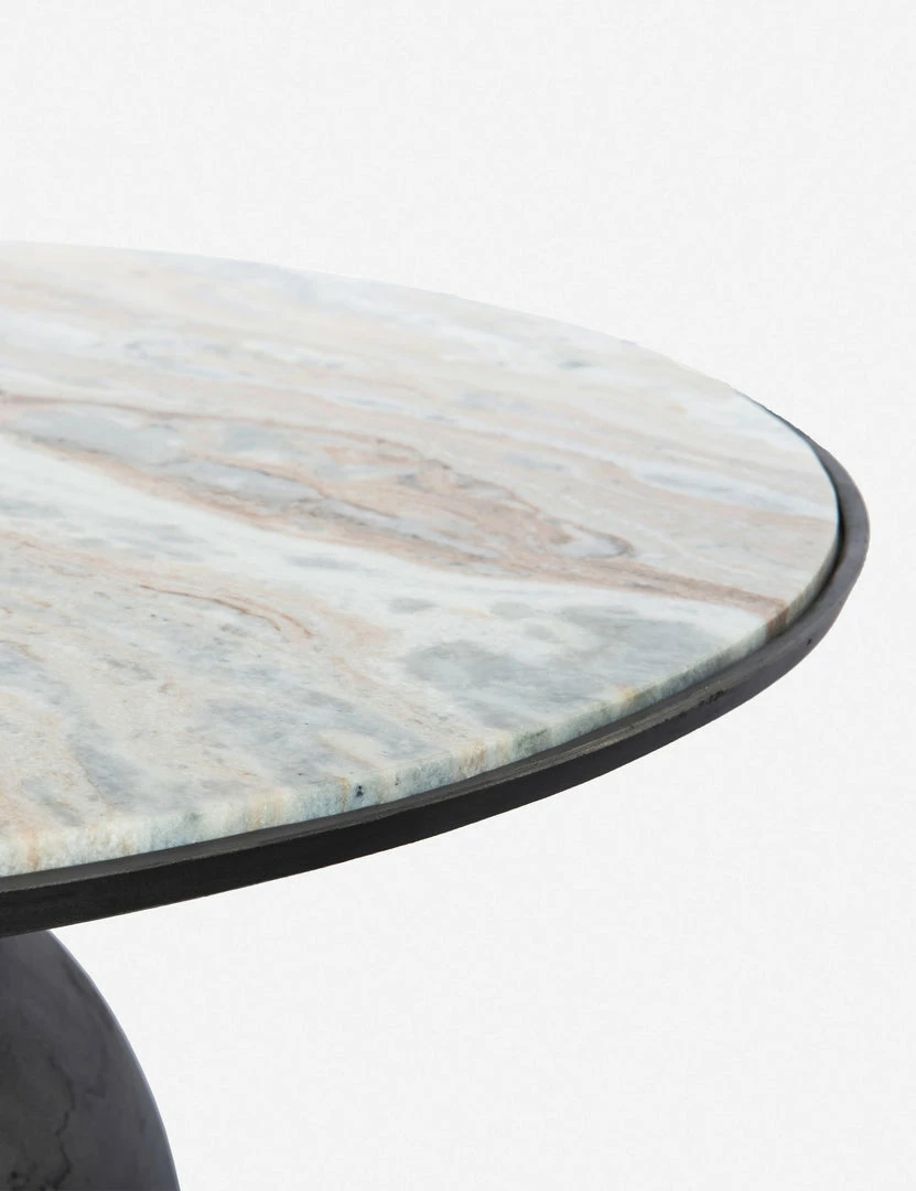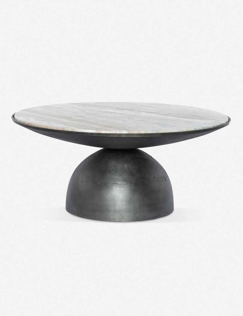Modern and sculptural, this round coffee table brings artful balance to your living room. The half-sphere pedestal base supports a round marble table top for contrasting tone and texture.