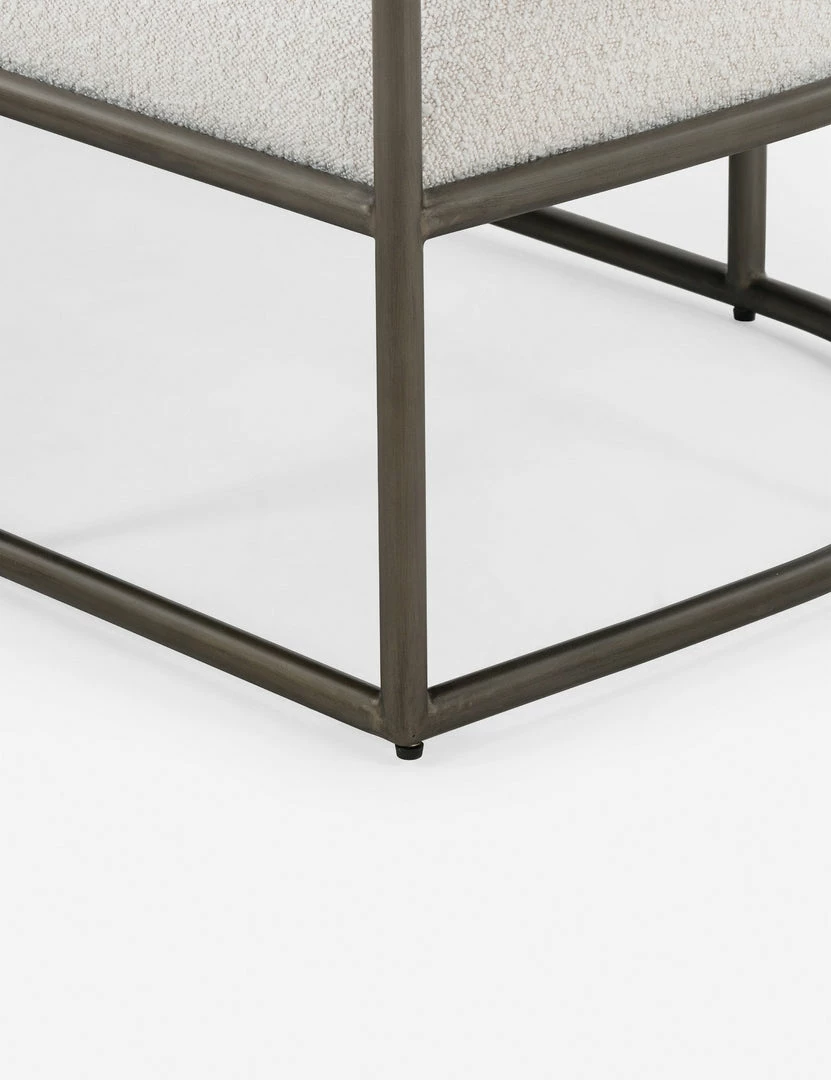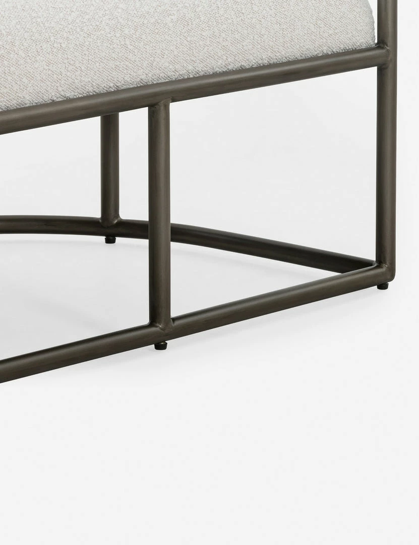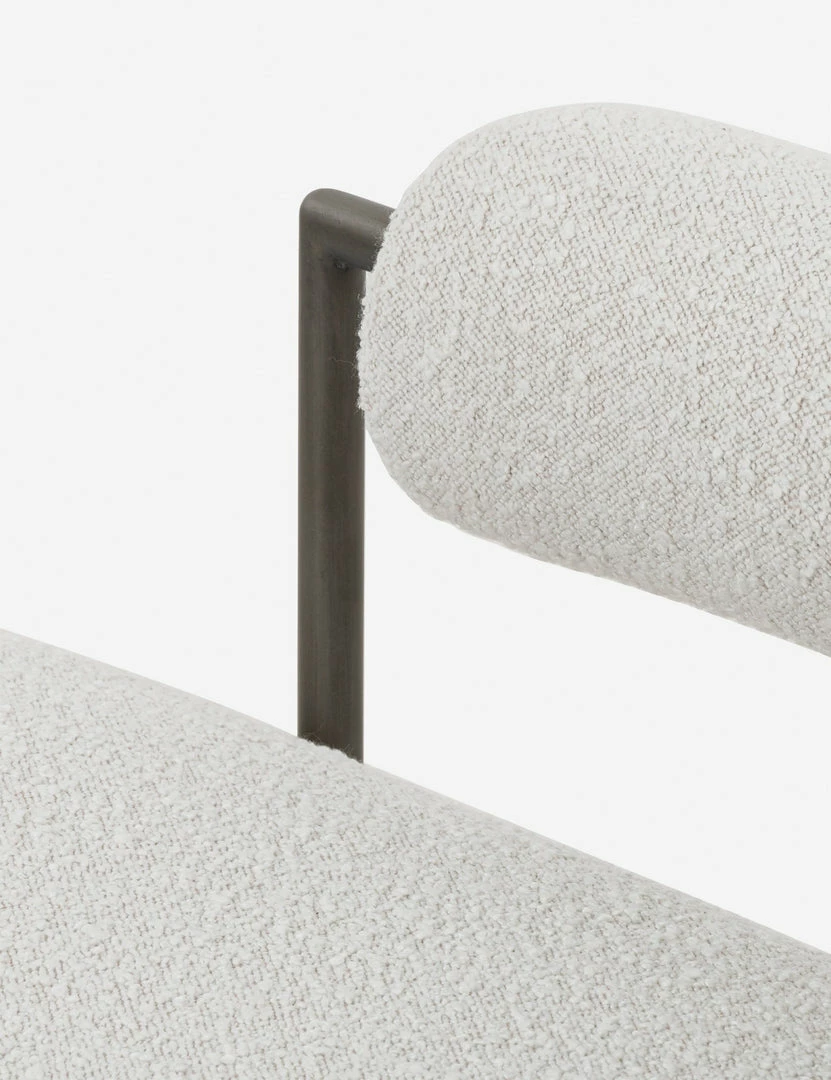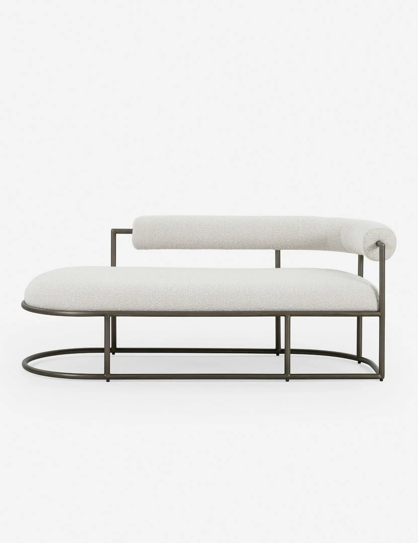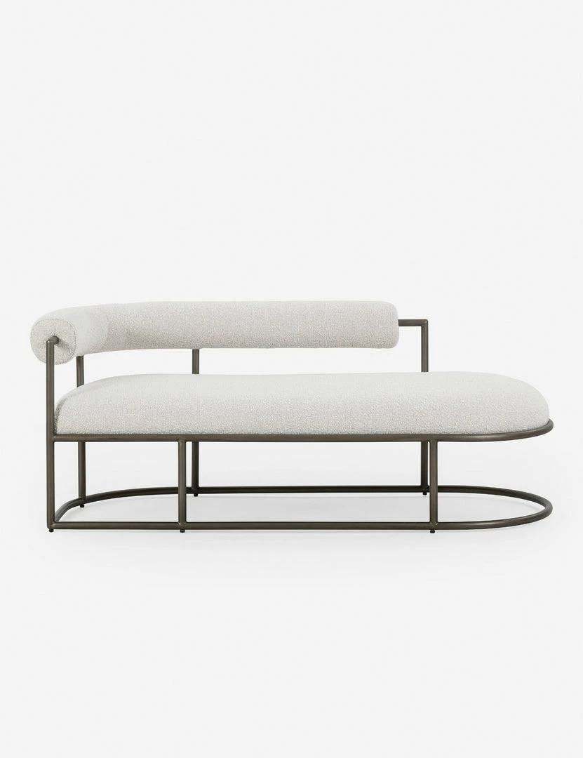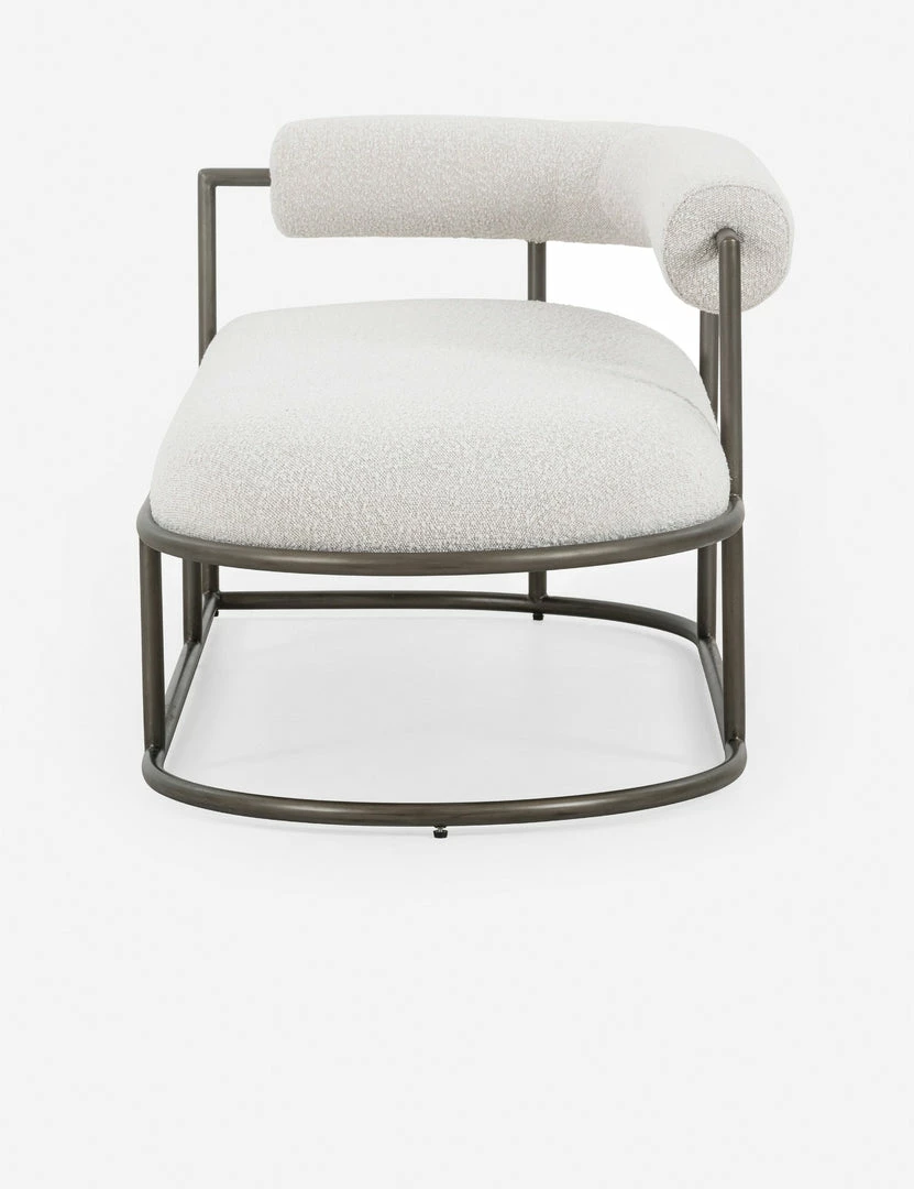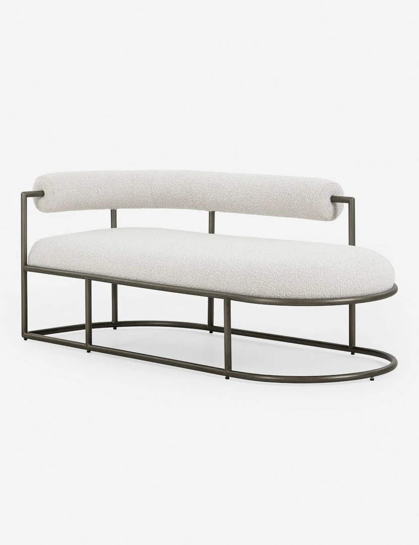 A slate-brushed iron frame and curved chaise-like design are finished in a durable fabric made to mimic the soft texture of bouclé in a light neutral tone that will fit most spaces. This streamlined chaise is an ideal way to add some elevated, cozy seating to an airy or transitional space.