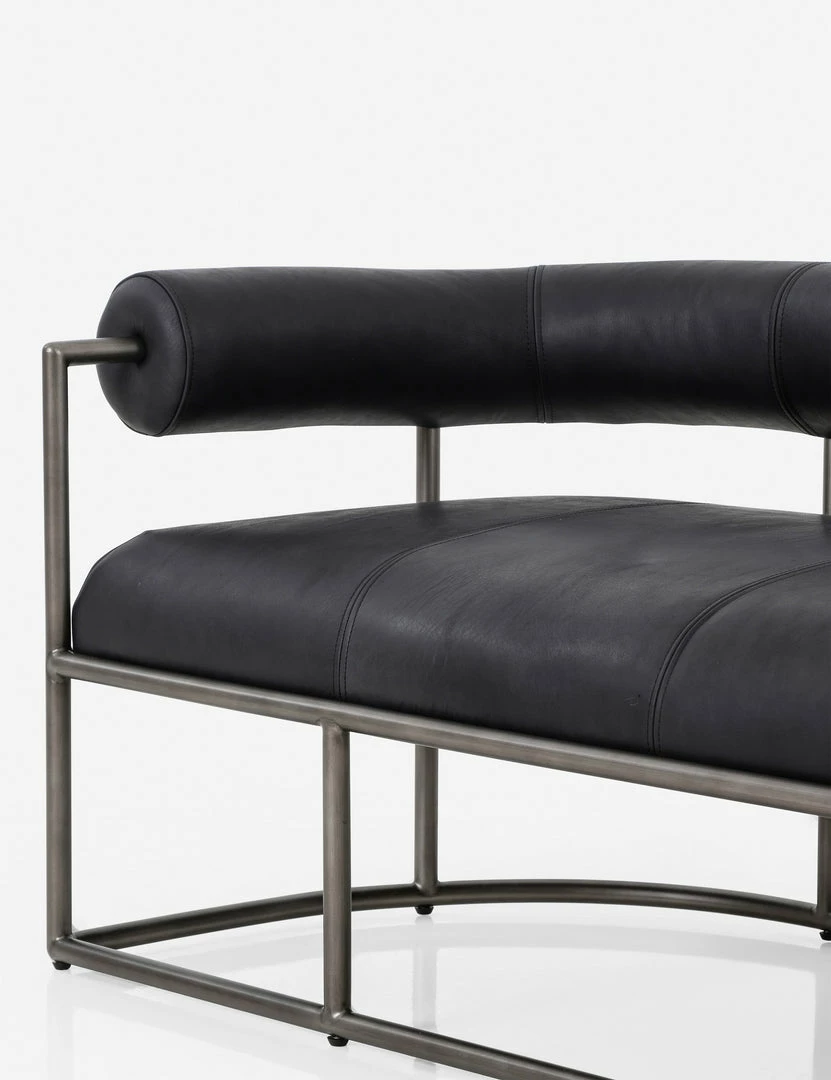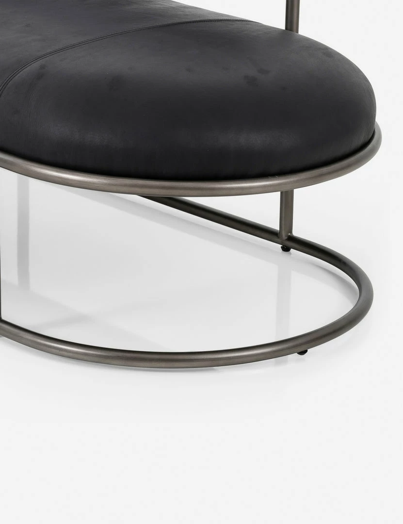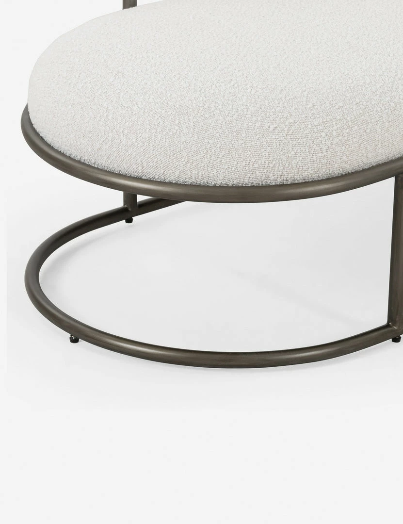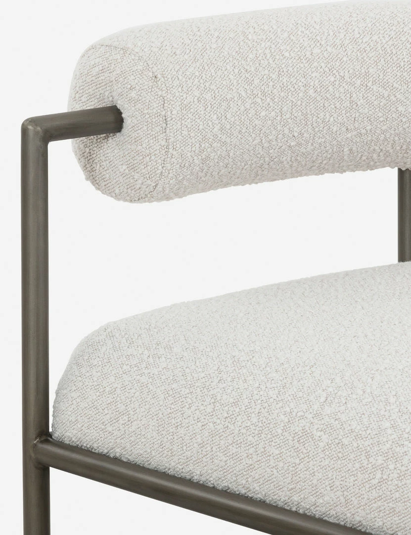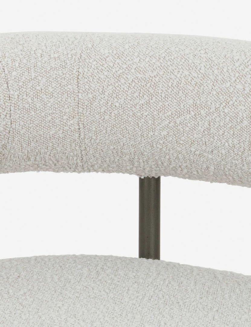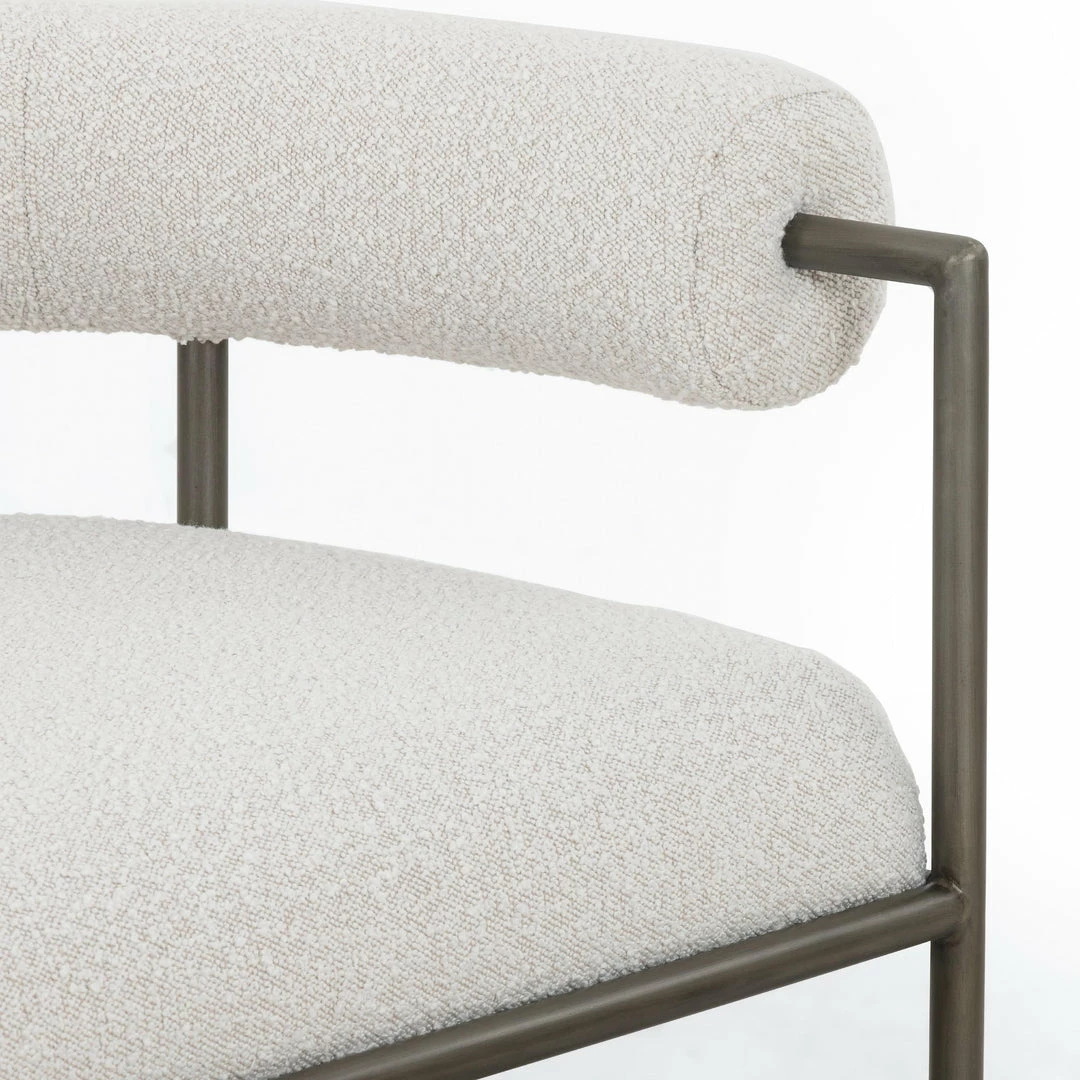 A slate-brushed iron frame and curved chaise-like design are finished in a durable fabric made to mimic the soft texture of bouclé in a light neutral tone that will fit most spaces. This streamlined chaise is an ideal way to add some elevated, cozy seating to an airy or transitional space.