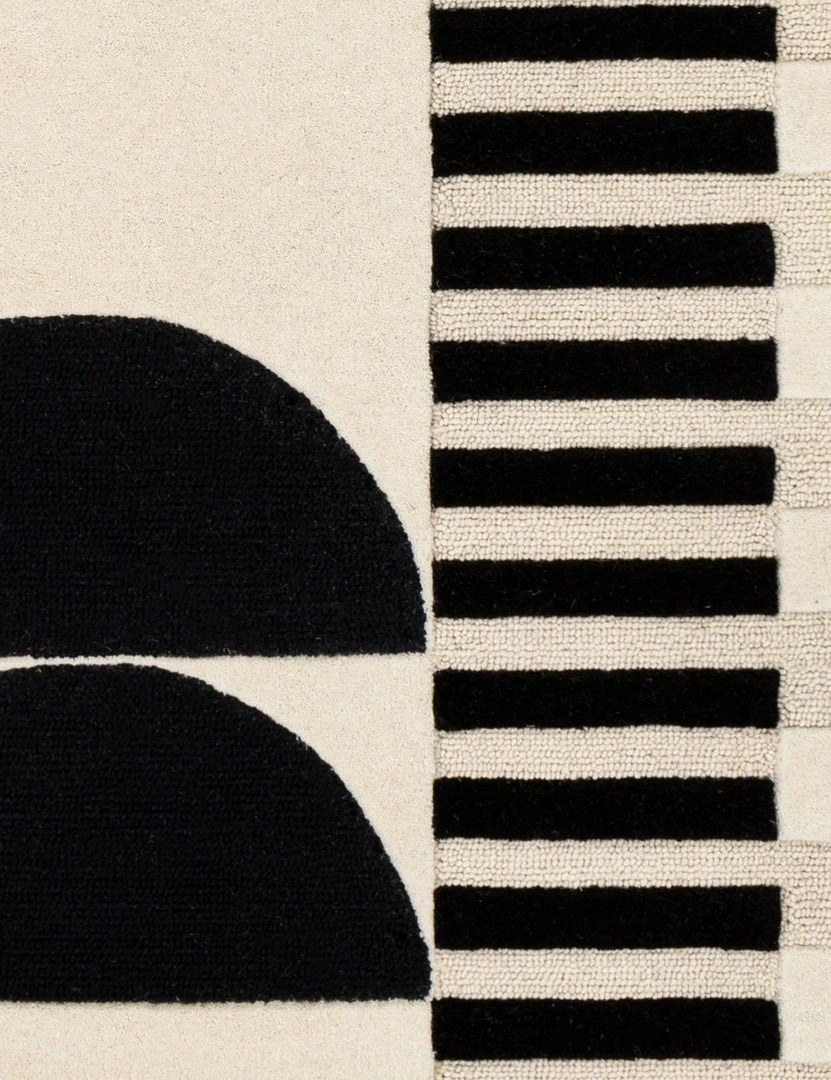 Hand-tufted and made from wool, the Pique Rug is a modern, monochromatic area rug for your living spaces. This black and white rug’s geometric design is eye-catching and has a mixed pile that adds depth and dimension, creating a centerpiece abstract area rug.