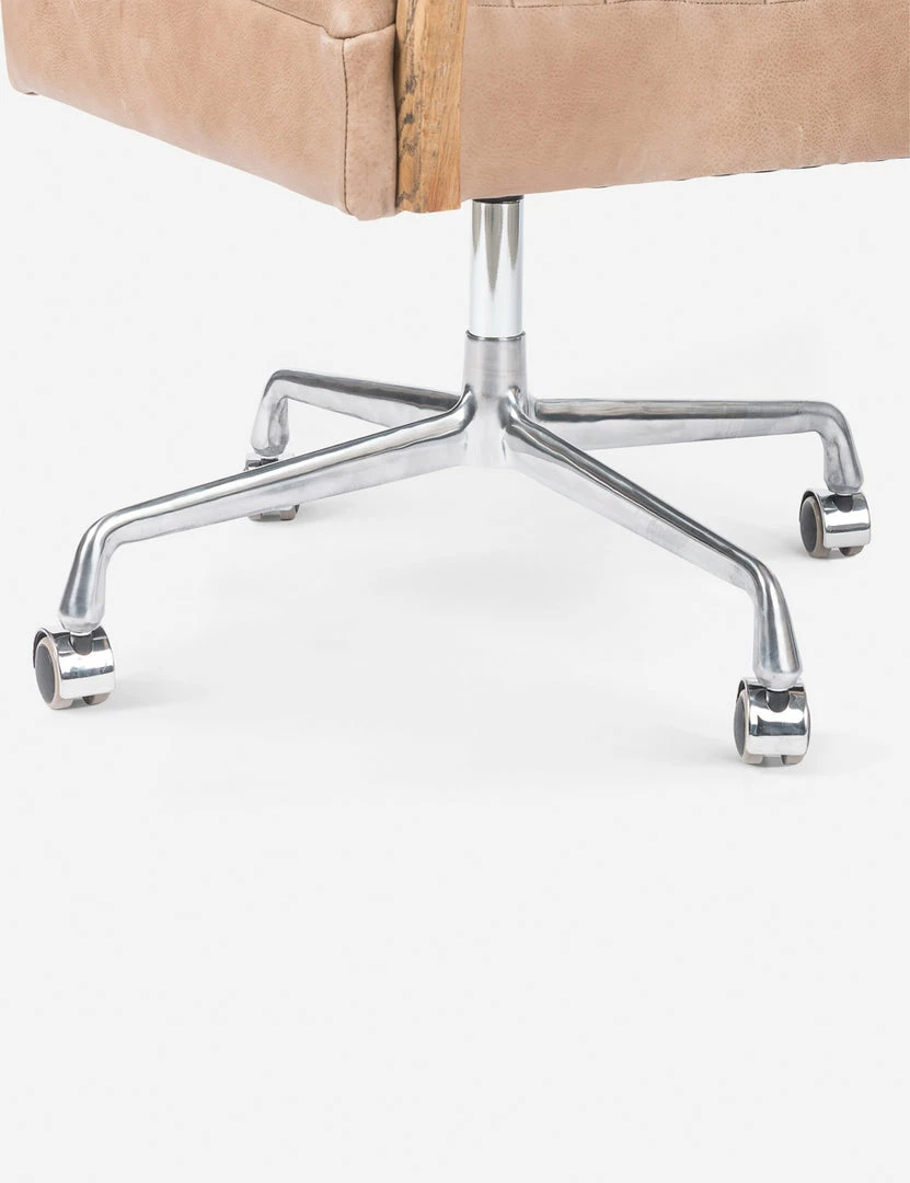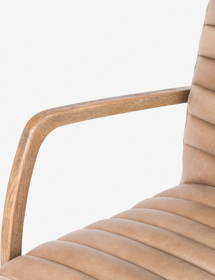 Refresh your home office with this polished take on a classic desk chair design featuring a channel tufted seat. Curved wooden arms and a stainless steel caster base provide functional appeal without compromising style—the perfect touch for a transitional workspace.