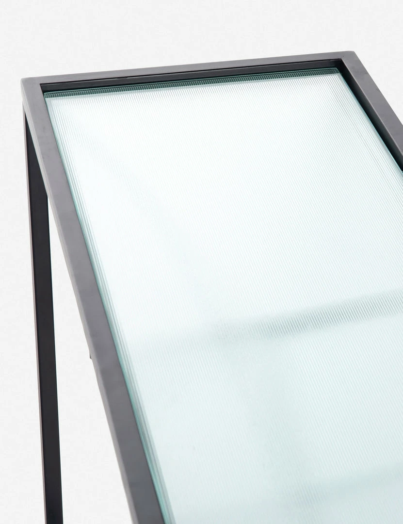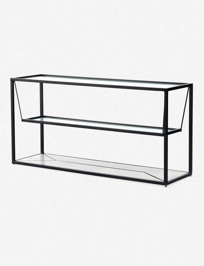 The mixed materiality of this console table feels surprisingly light and airy with its open frame, fluted glass top and shelf, and polished white marble base. That shelf elegantly suspends down from the black-finished iron frame and all three levels provide ample space to display your favorite curios and books.