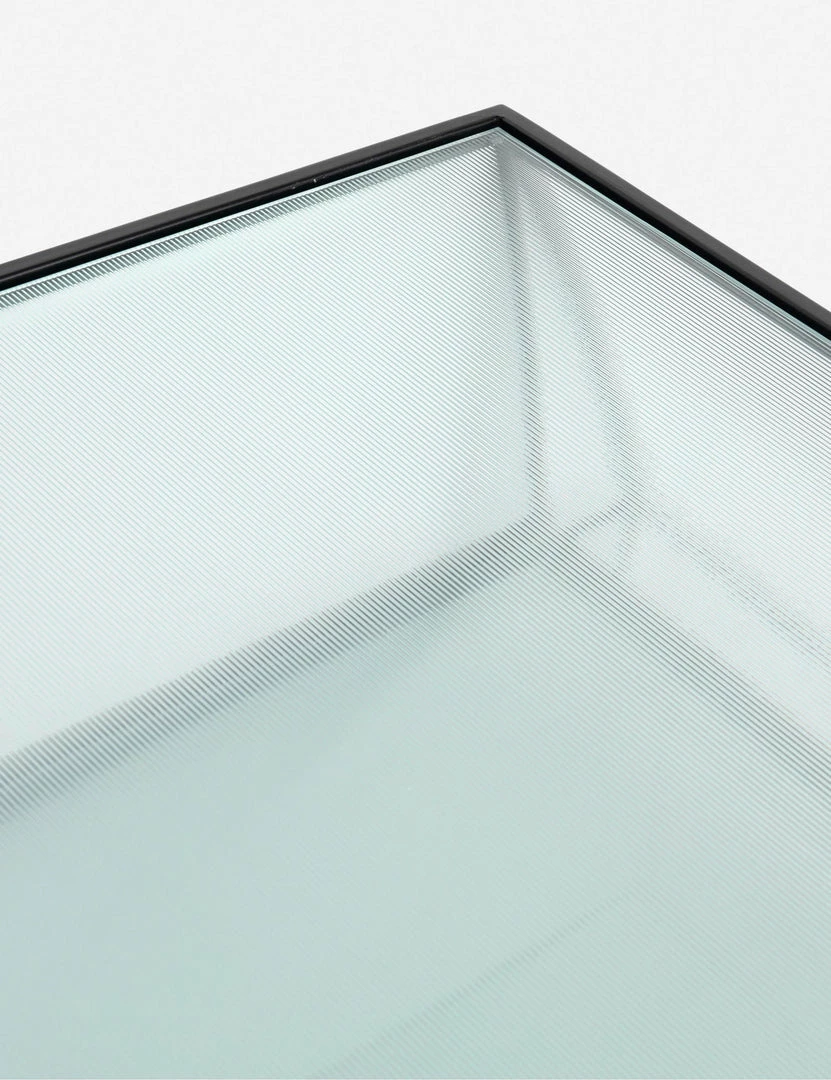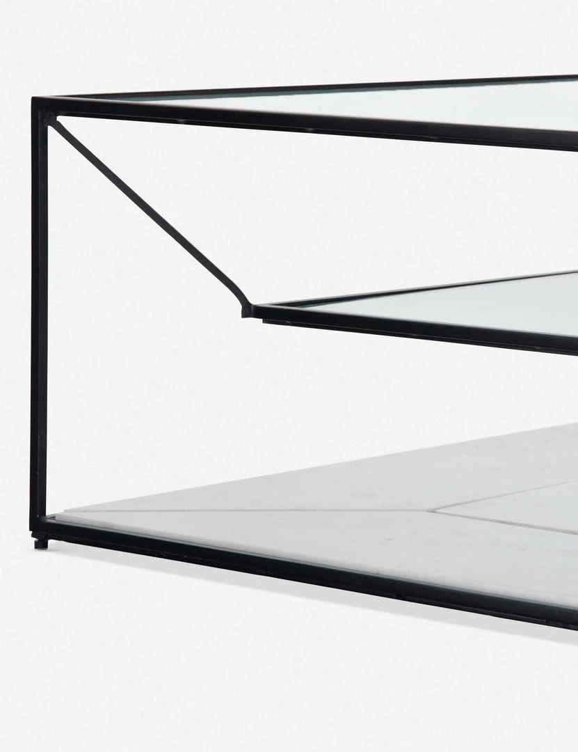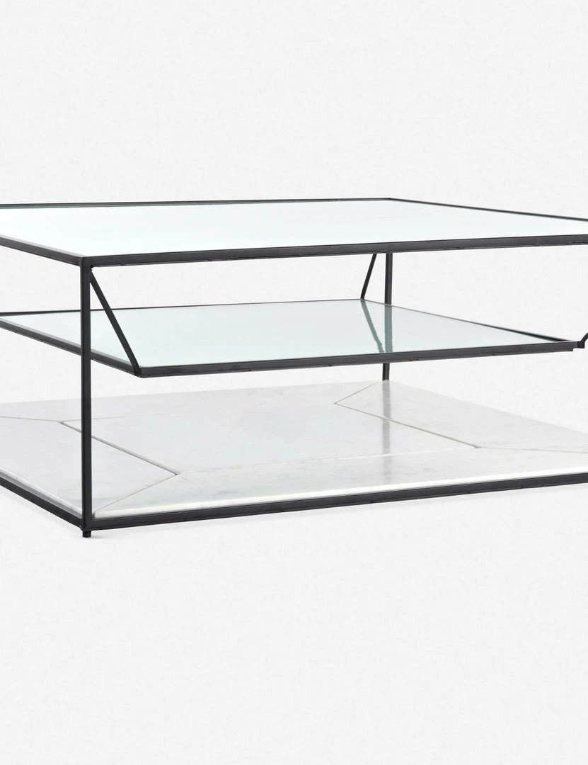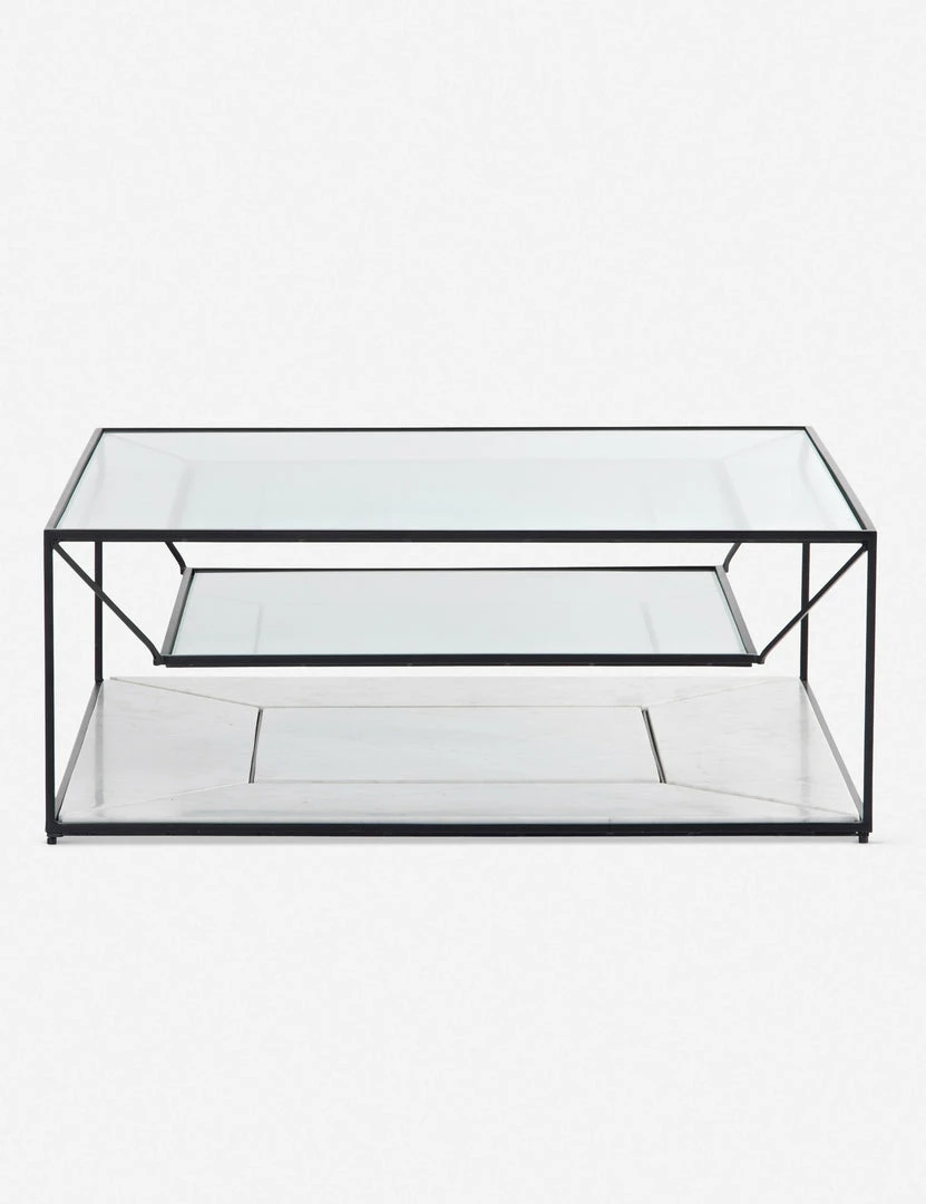 The mixed materiality of this square coffee table feels surprisingly light and airy with its open frame, fluted glass top and shelf, and polished white marble base. That shelf elegantly suspends down from the black-finished iron frame and all three levels provide ample space to display your favorite coffee table books and curios.