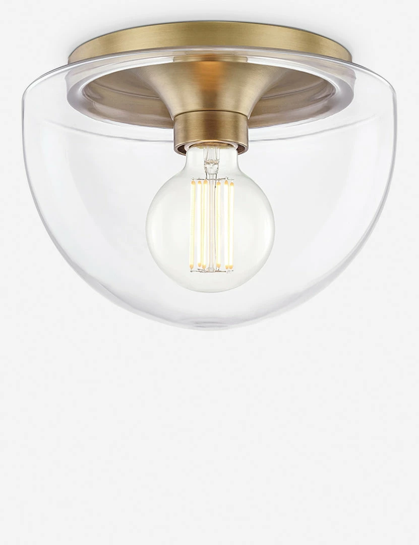 With its straightforward minimalistic design, the Raya’s spherical glass shade and antiqued brass base adds modern character to a room. Its sleek and simple form stands up to a variety of styles without overpowering the aesthetic.
