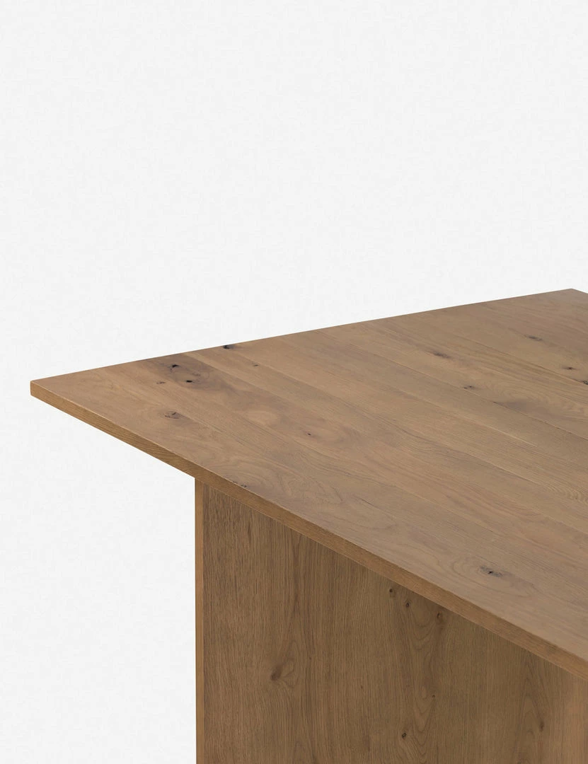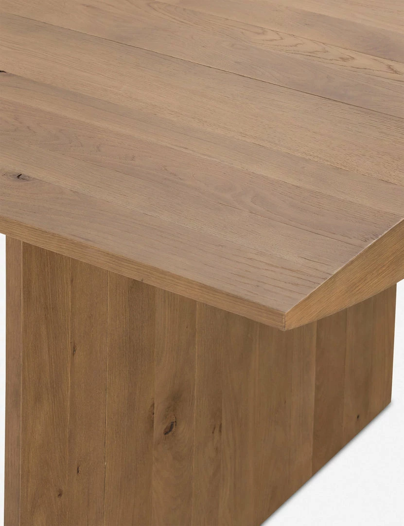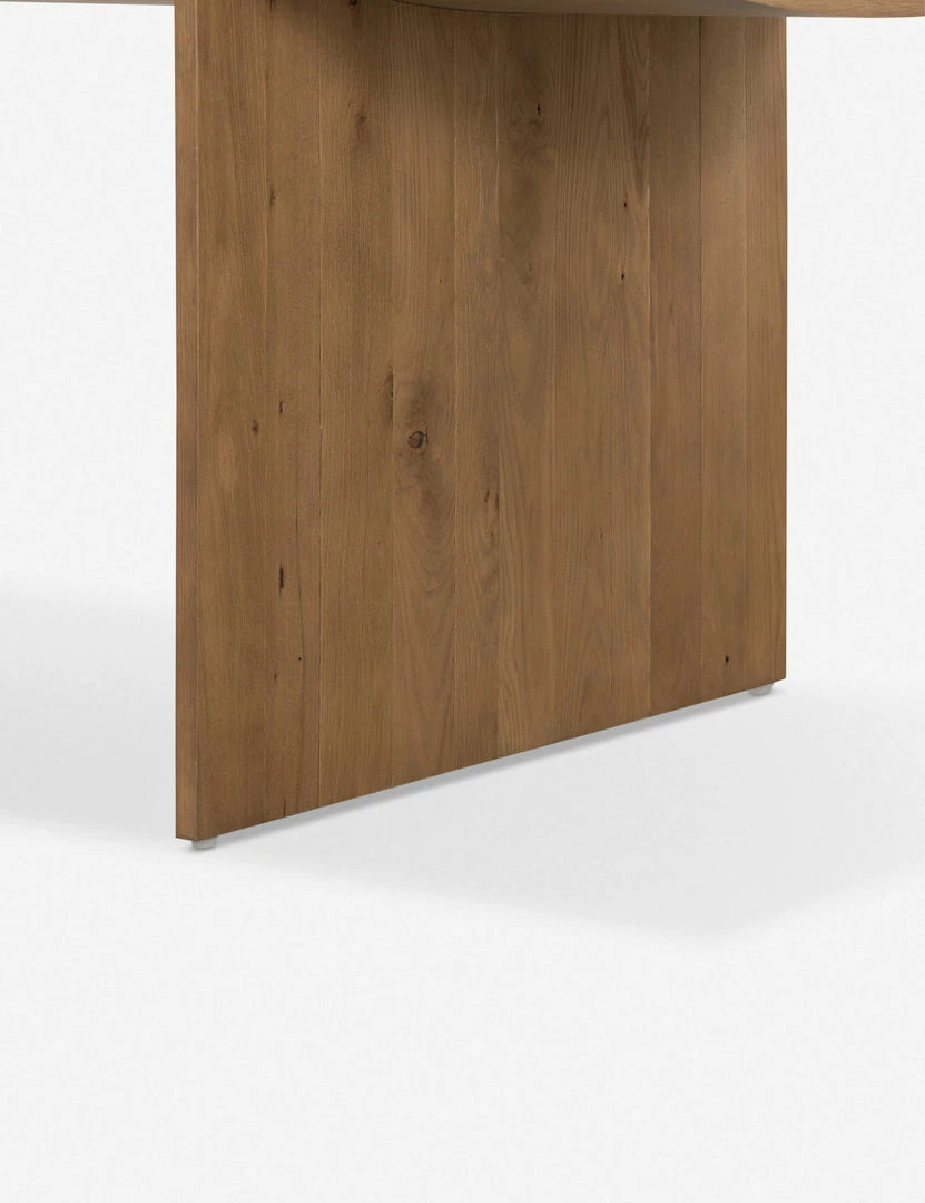 Casting a clean, cut silhouette, this dining room table design is softened by a curved-bottom tabletop sturdily set on two flat, solid legs. Clad in a beautiful oak veneer for natural grain appeal, this dining table is a sculptural centerpiece that offers inviting warmth for entertaining or everyday gathered meals.