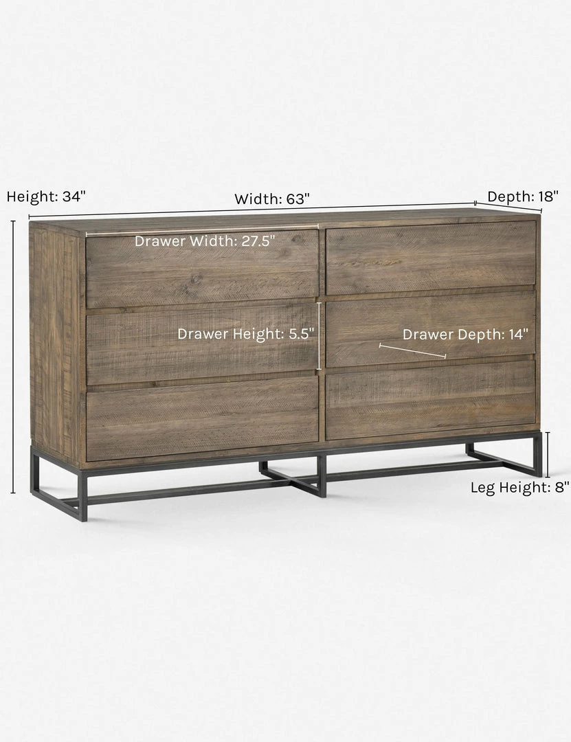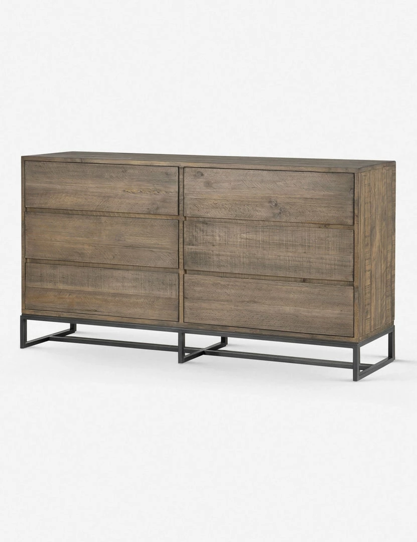 For bedrooms with a touch of rustic style, this dresser fits right in. The unique grain and knots in the solid pine add endless character, and the metal base and handle-less design keeps the look totally updated.