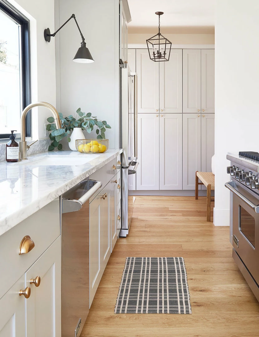 Made from 100% cotton, our machine washable Rika Mat has a wide checkerboard pattern in black and light gray hues. Its simple design blends with neutral-toned, minimalist decor, including light wood pieces and woven baskets. We love this mat for a cozy touch in your entryway, kitchen, or powder room.