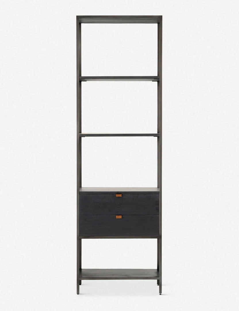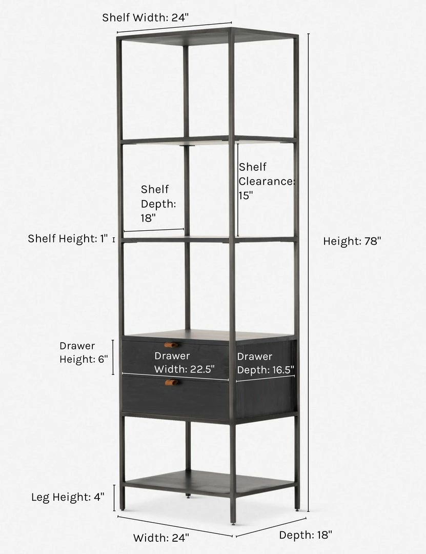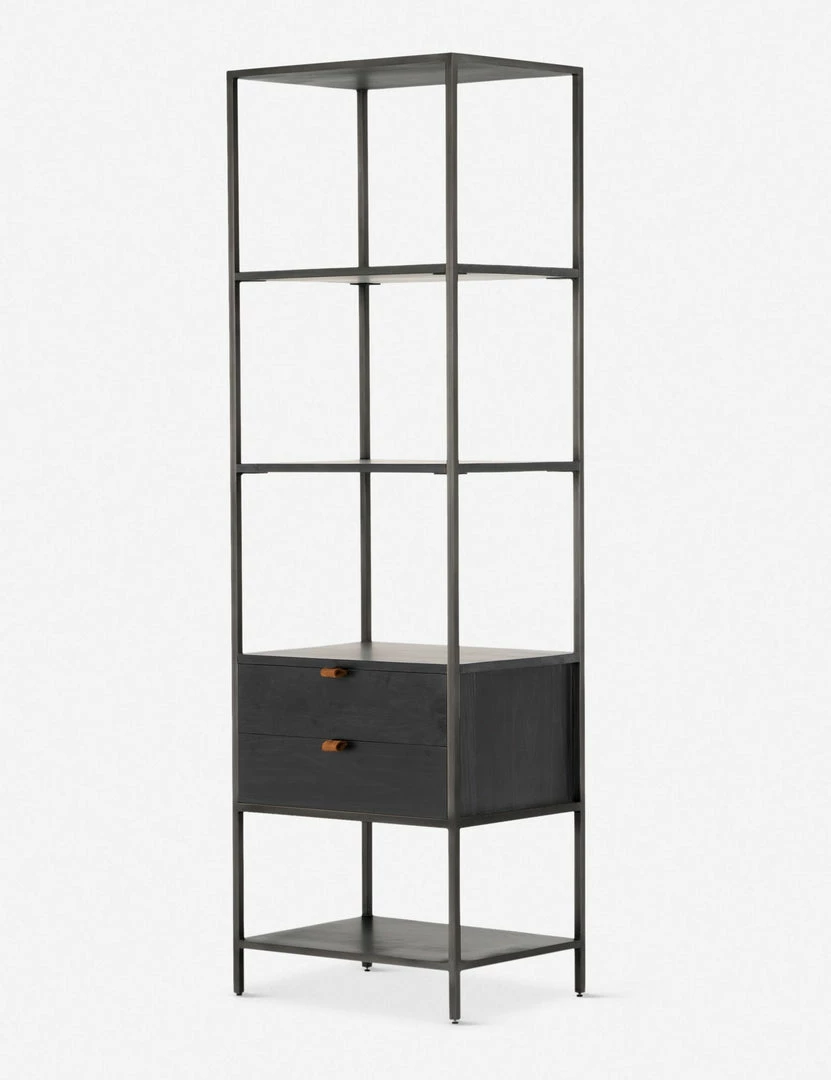 Keep your style grounded (and super organized) with this tall wooden bookcase. Features elements of mid-century aesthetics like a black wash, slim iron base, and top-grain leather drawer pulls.