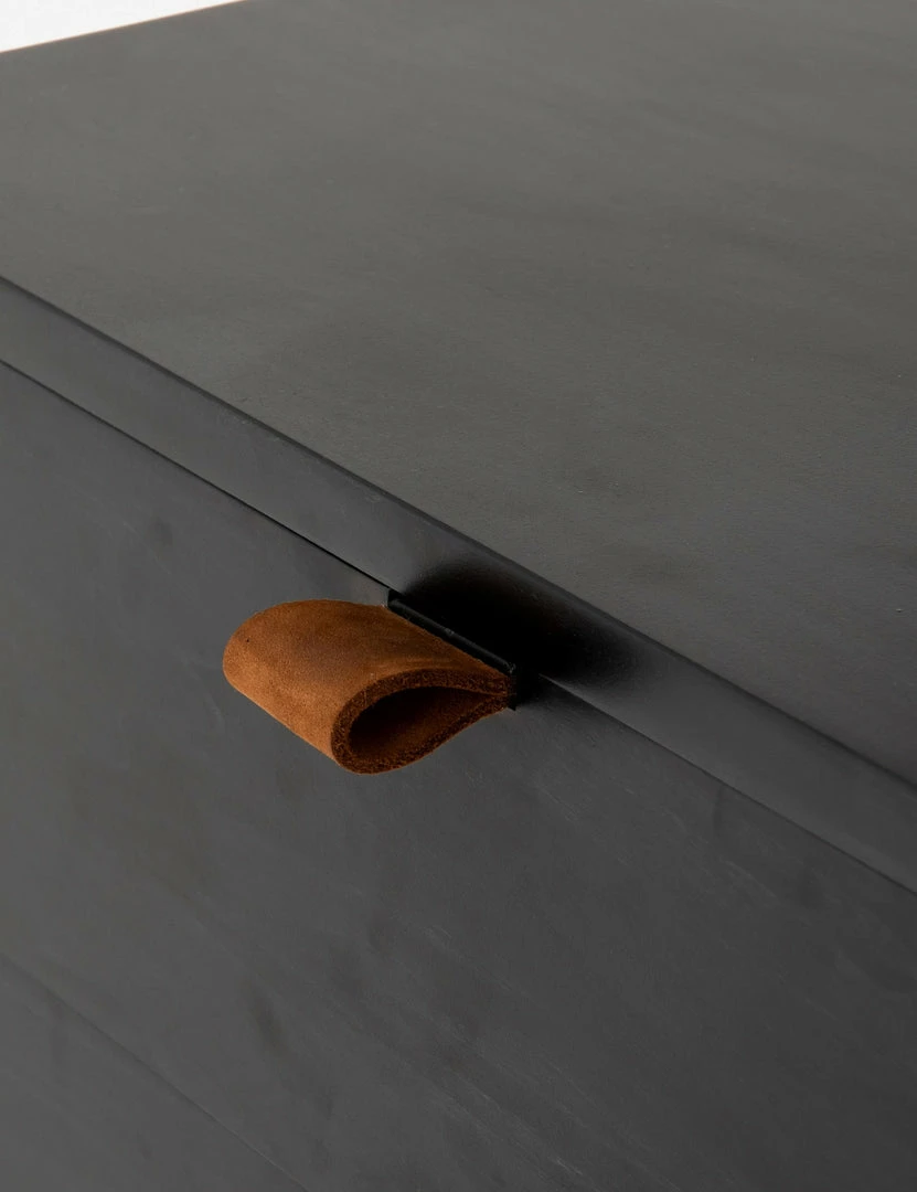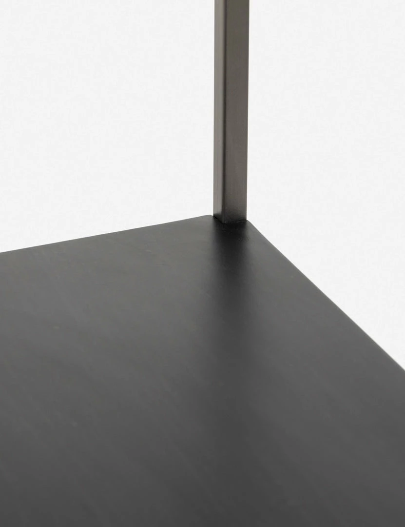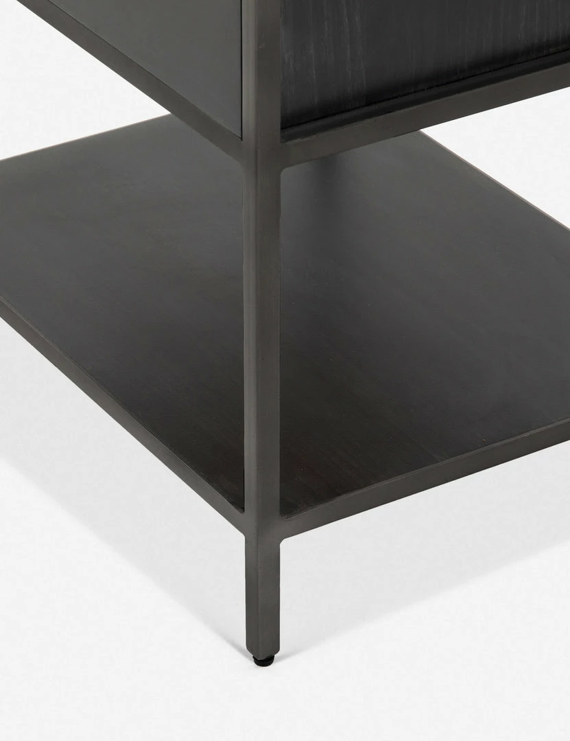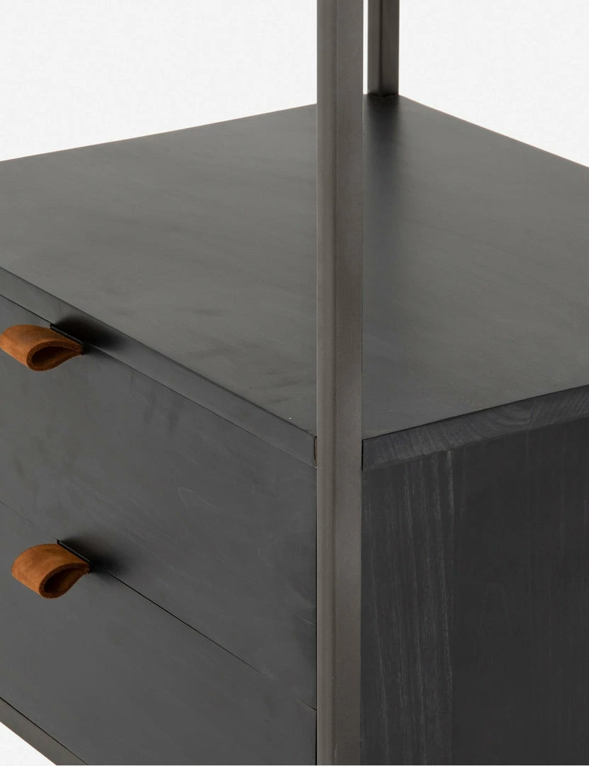 Keep your style grounded (and super organized) with this tall wooden bookcase. Features elements of mid-century aesthetics like a black wash, slim iron base, and top-grain leather drawer pulls.
