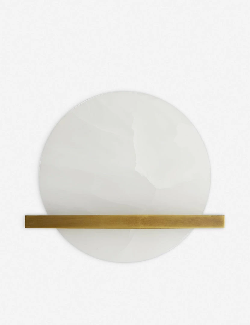 A modern indoor wall light fixture that brings a soft glow to any room, this wall sconce features a circle of white onyx stone resting in a sleek metal frame. As light diffuses through, you can see the delicate veining of the stone, adding subtle texture to the look.