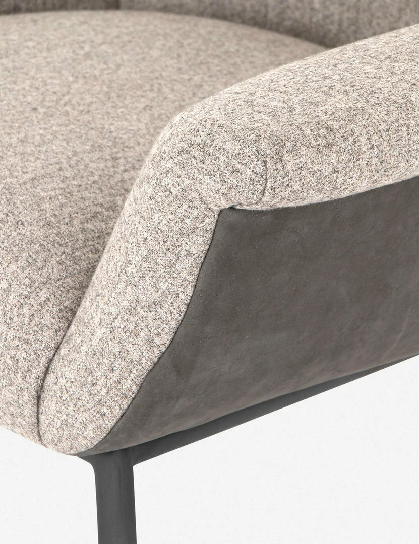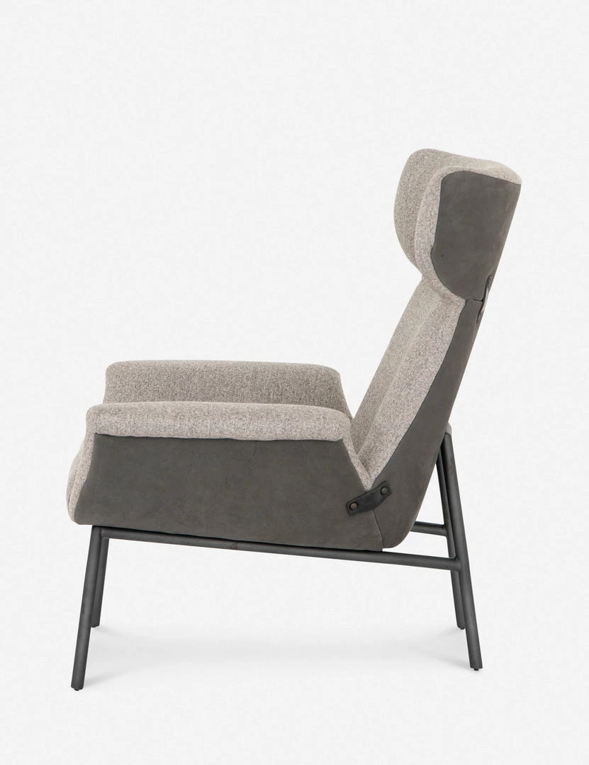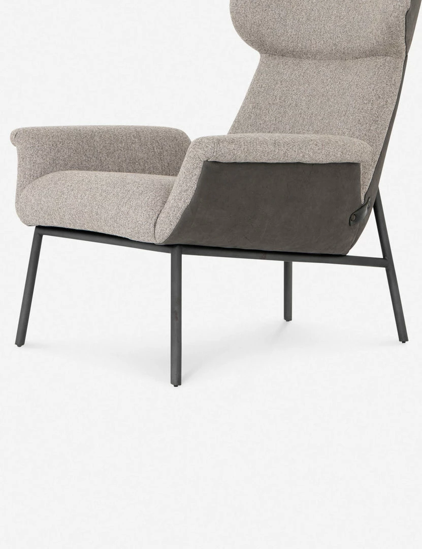 Classic wingback style is given a fresh update with this dramatic accent chair. Clad in a two-tone upholstery of herringbone-like fabric and supple top-grain leather, then finished with grommet straps at the sides and back, this chair is made for comfort and tailored for a refined aesthetic that blends traditional touches with modern design.