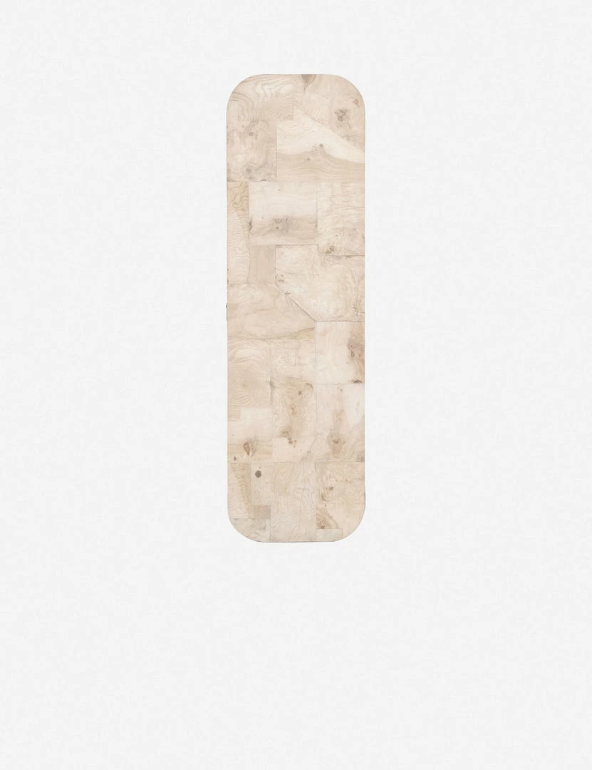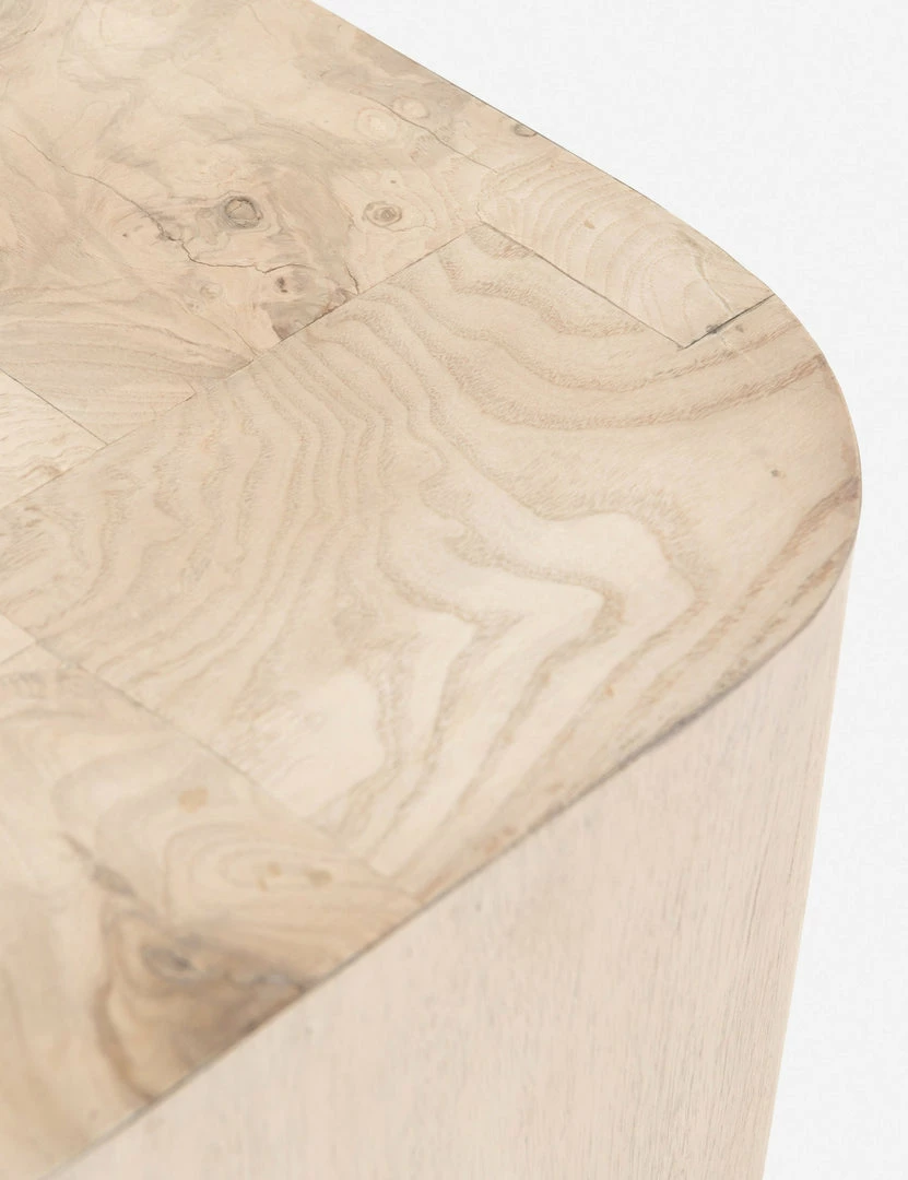 Freshen up the look of your space with the patchwork tabletop design, rounded corners, and lighter walnut finish of this wood console table. Crafted from bleached ash burl, it features mahogany veneer sides and is finished with a sleek inset base. Whether in your entryway or living room, pair this console table with desert hues or tailored neutrals.
