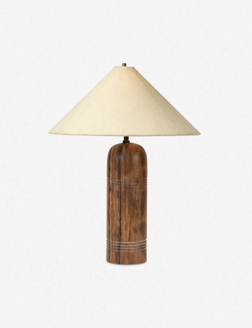 This table lamp will bring the signature look of marble everywhere, from your entry to your home office. In a dark beige finish, the lamp’s turned marble base features etched detailing at top and bottom and a tapered shade for a transitional look with a mid-century undertones.