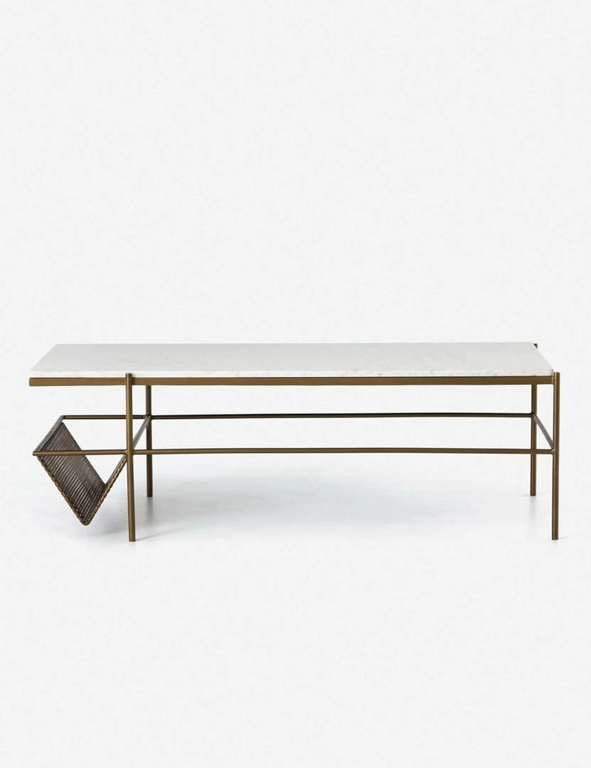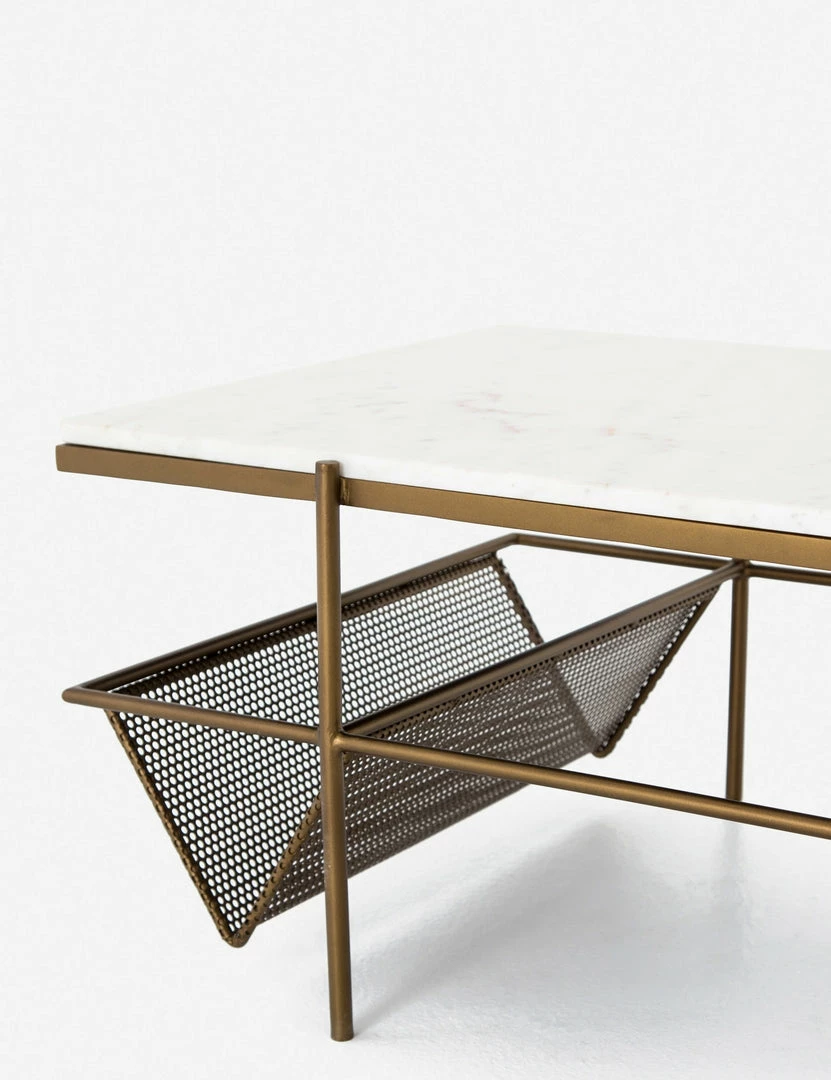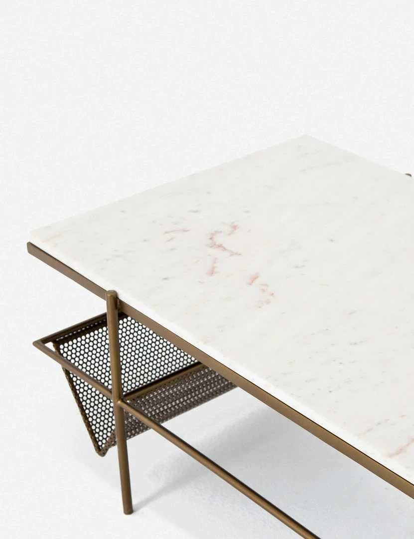 The perfect way to keep your modern style light and fresh, this rectangular coffee table features antique gold hardware, a white marble top, and a mesh lower shelf perfect for storing books or magazines.