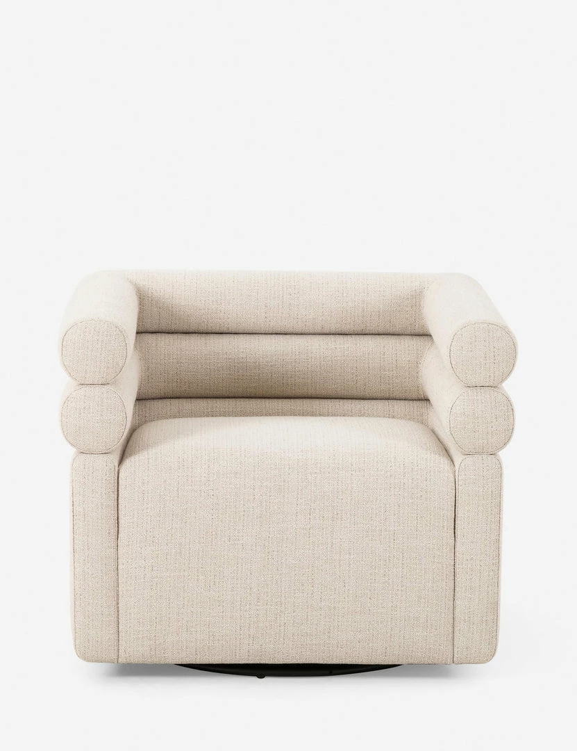 A cozy, bold accent chair with Bauhaus-like modern lines in its tubular arms and plush seat. Set on a base for a 360-degree swivel and upholstered with a durable fabric, this is a striking occasional chair for a home office or living room. Style it with a natural fiber throw for a warm and collected look.